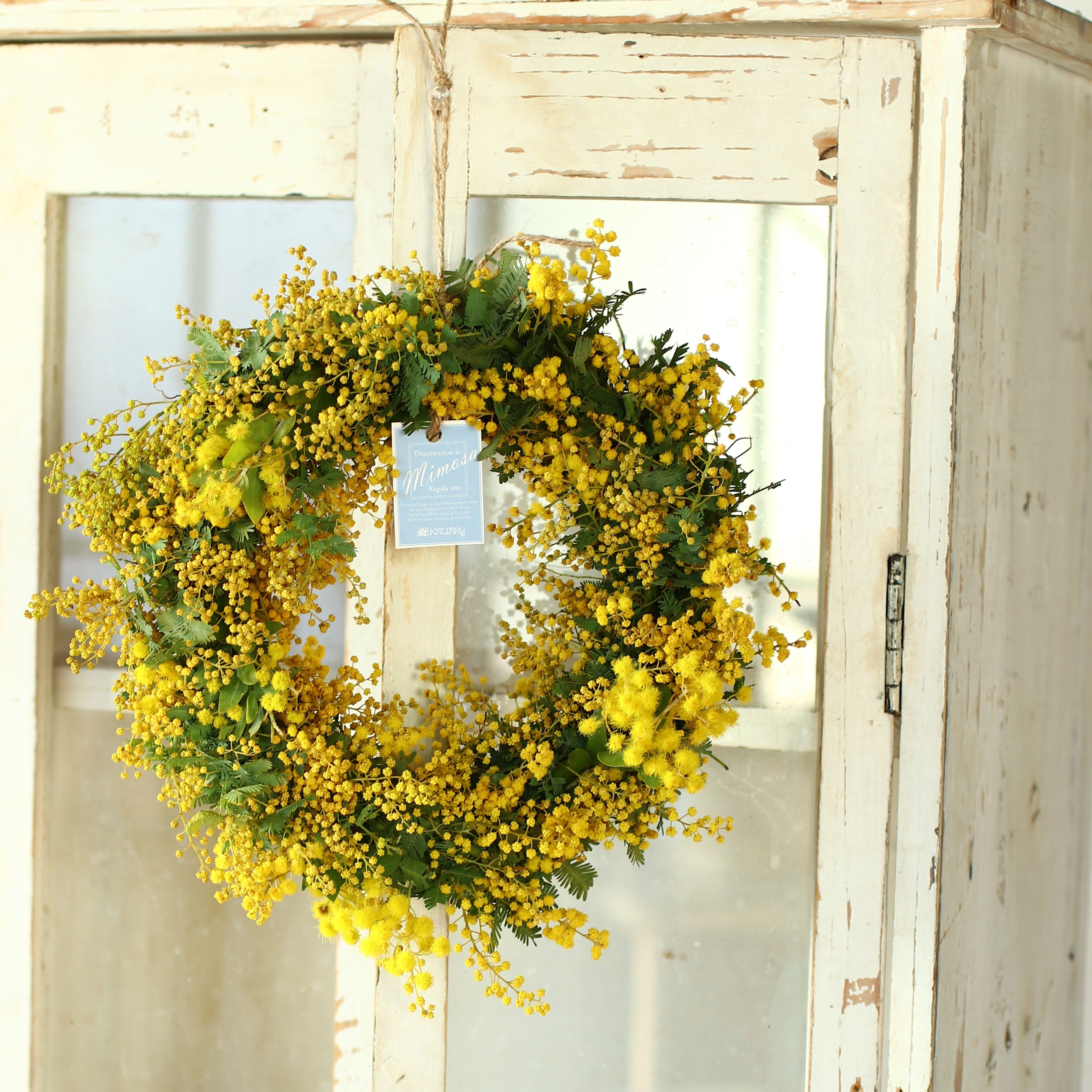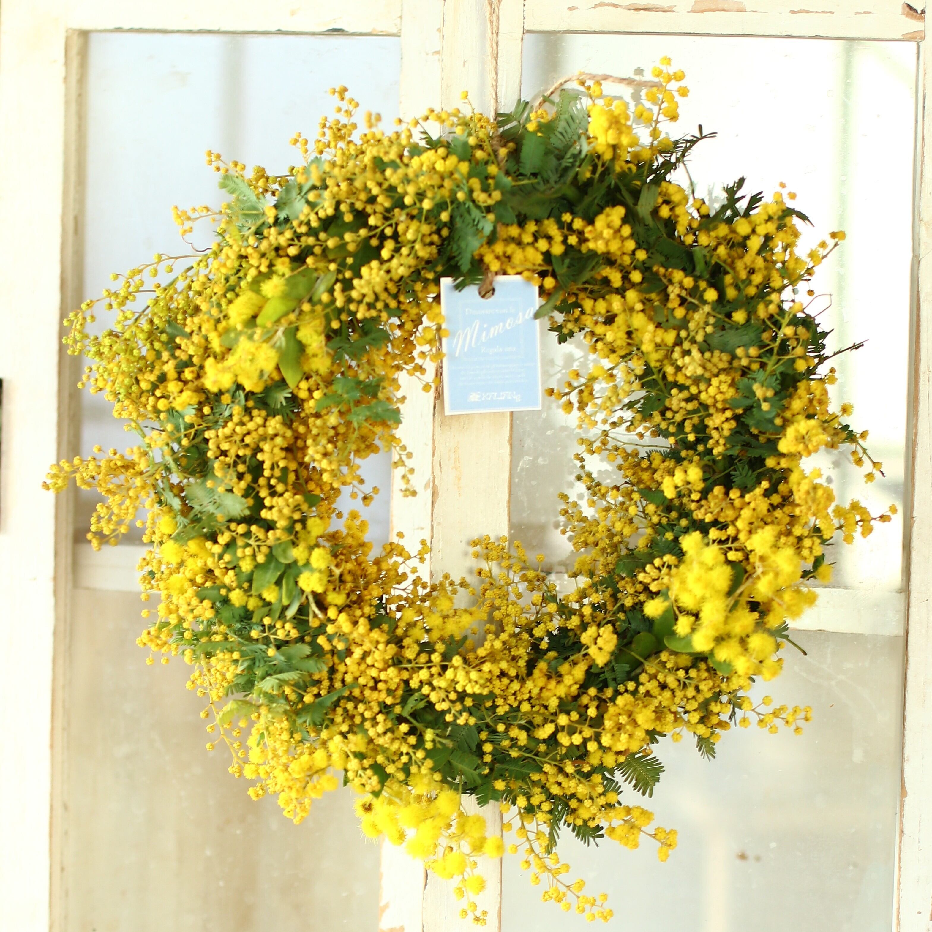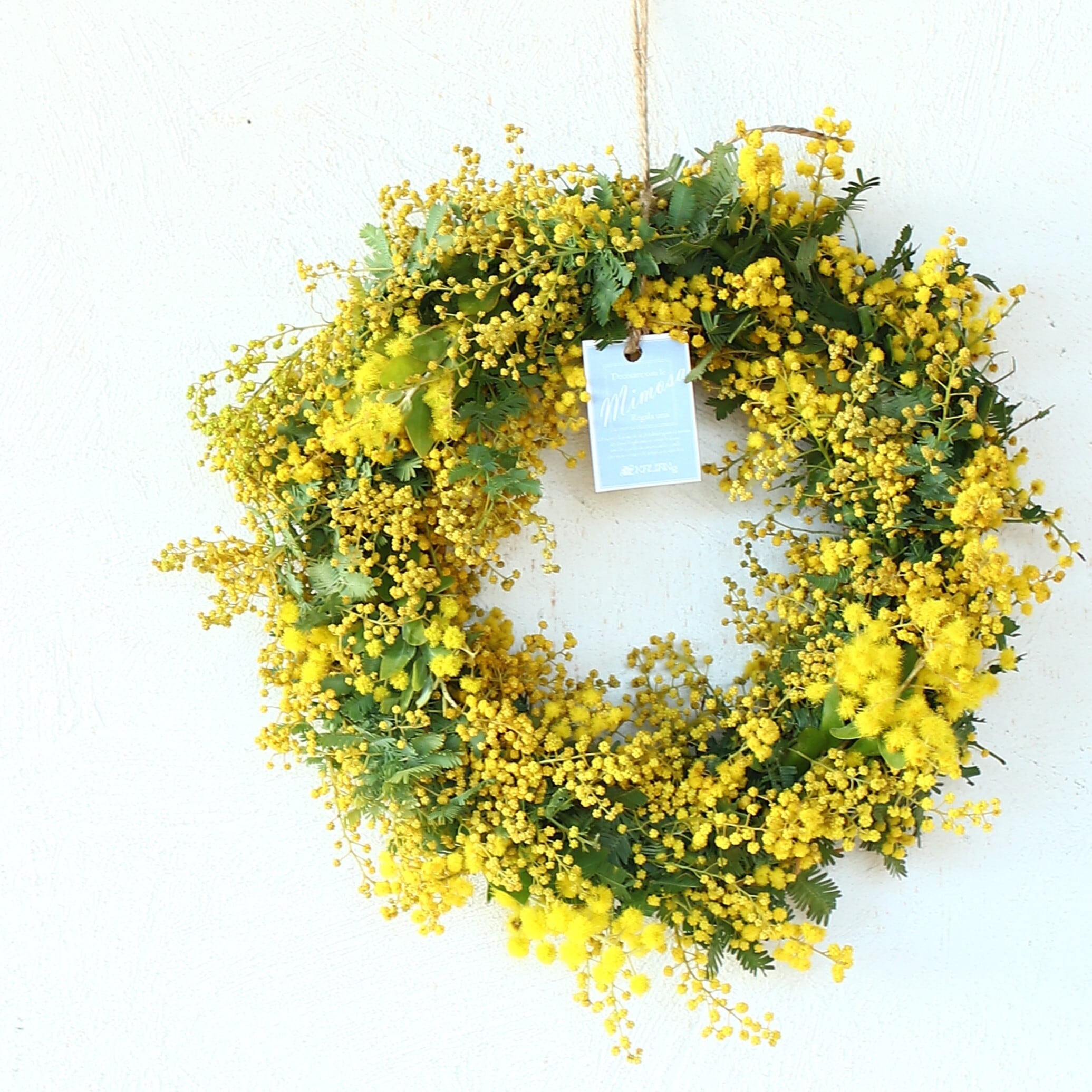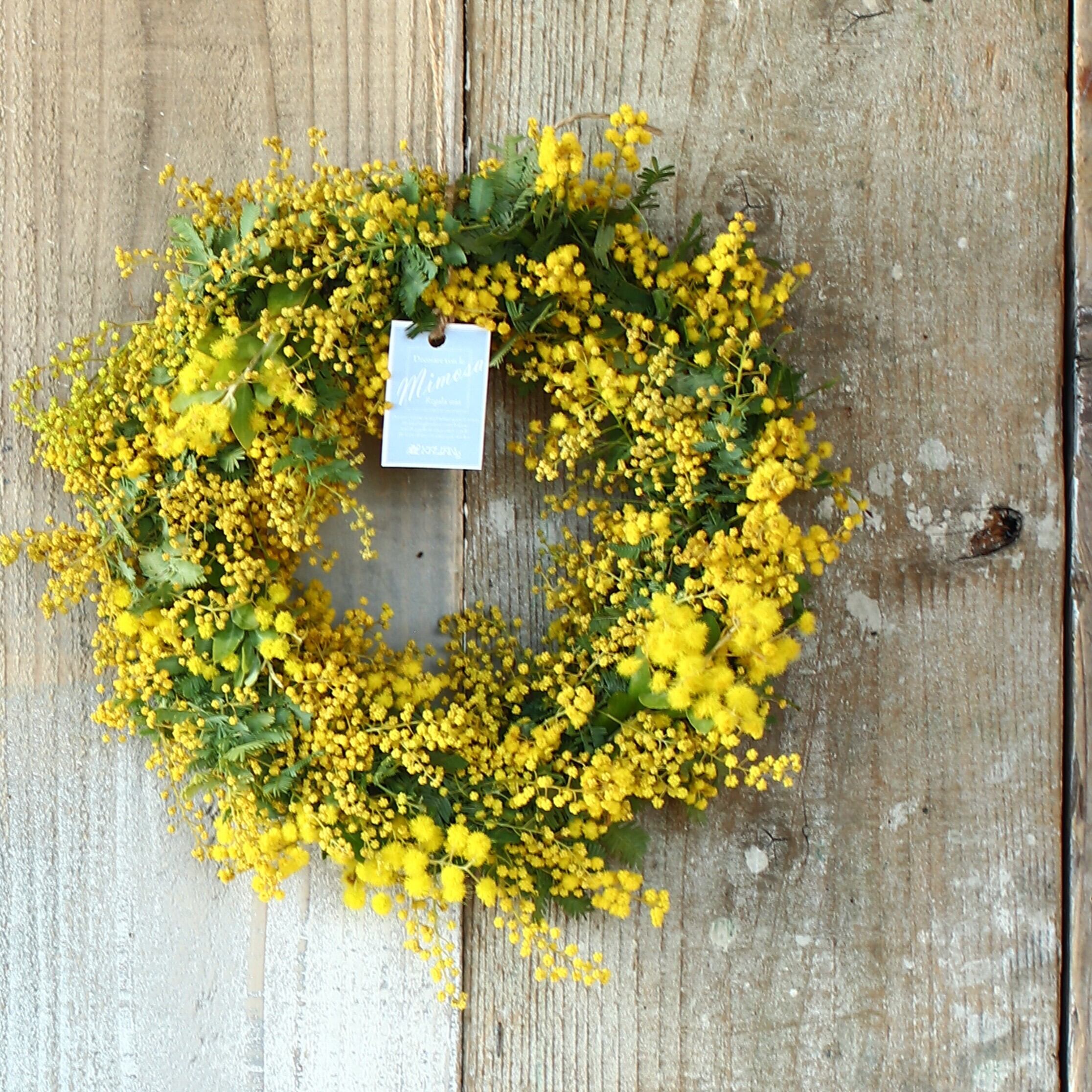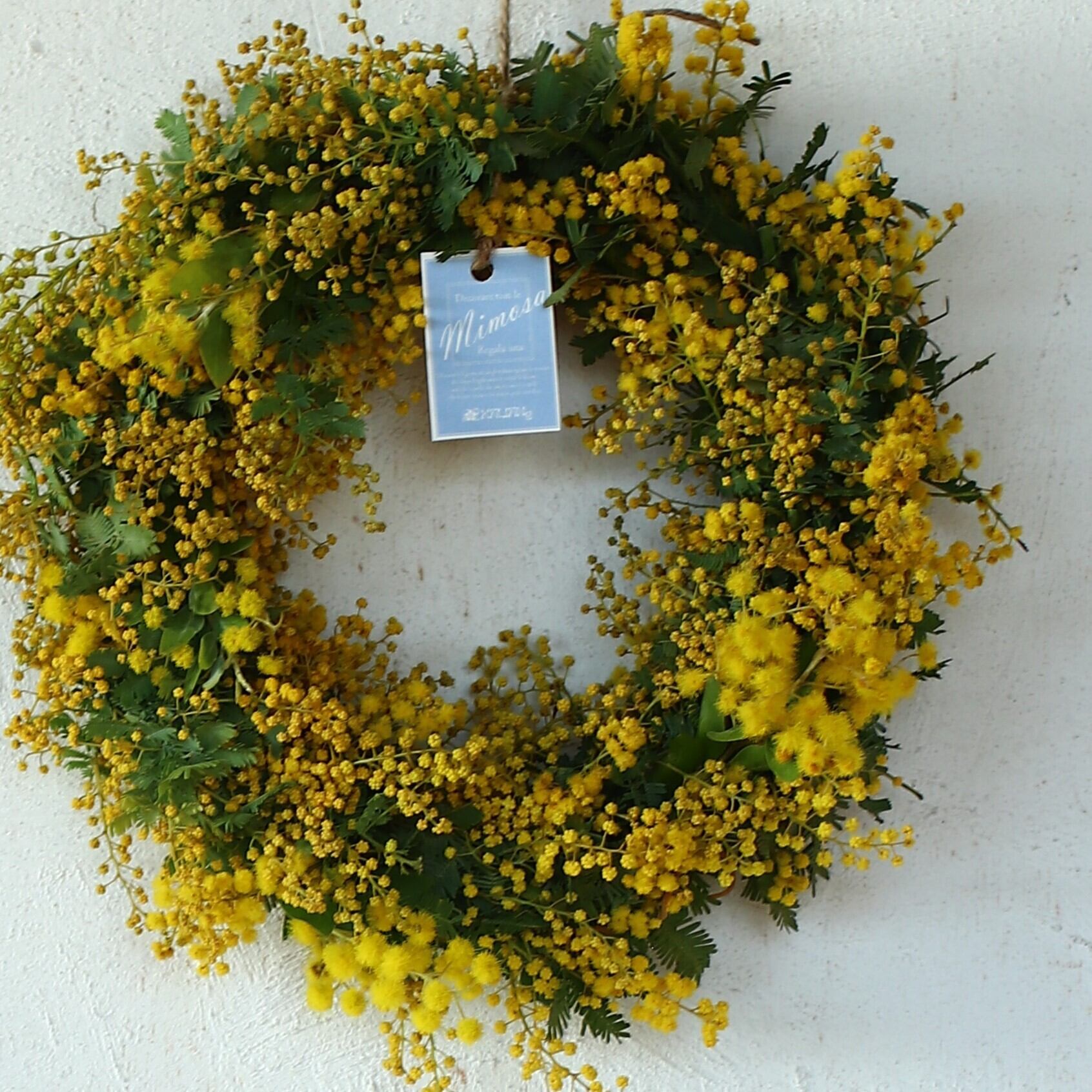 素朴で温かい雰囲気を持つこの「ミモザのドライフラワーになるフレッシュリース」は、皆様の特別な瞬間をさらに楽しく彩る素晴らしいアイテムです。季節感あふれるミモザリースは、特に春のシーズンに映える魅力を持っています。