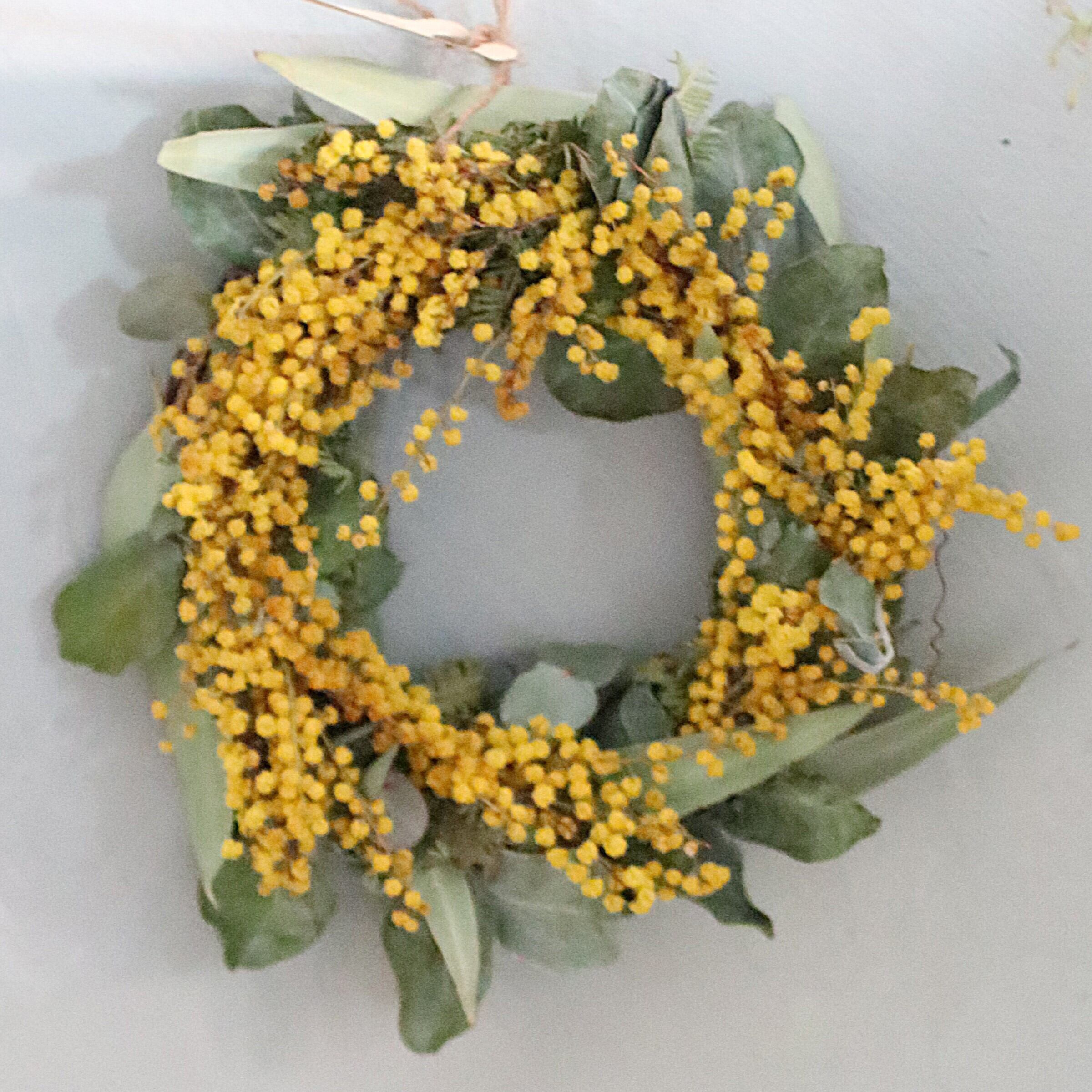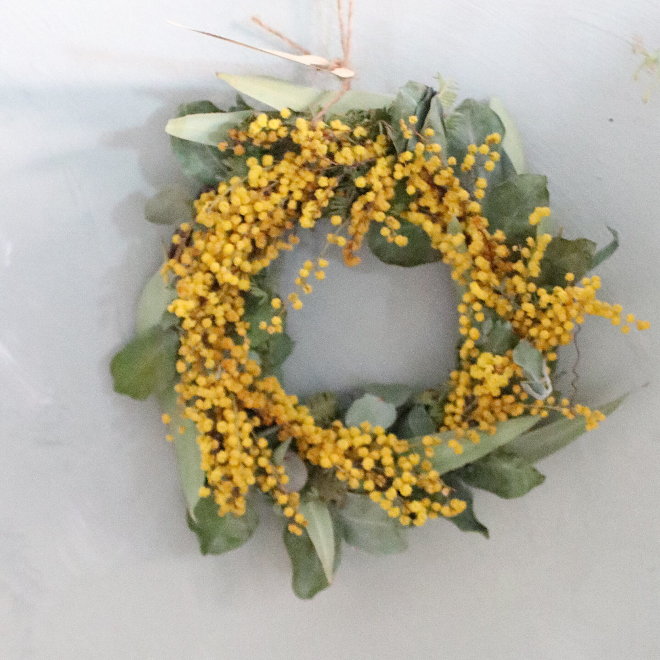 この「ミモザとユーカリのドライフラワーリース」Sサイズは、贈り物にも最適な、愛らしいリースです!