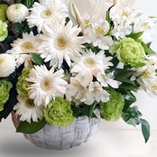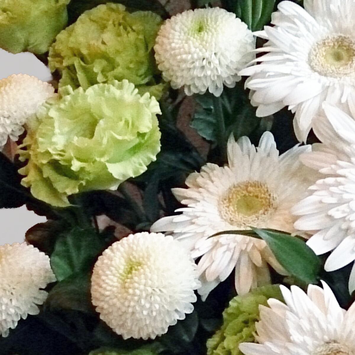 白いガーベラを基調に、優しいグリーンが美しく調和します。