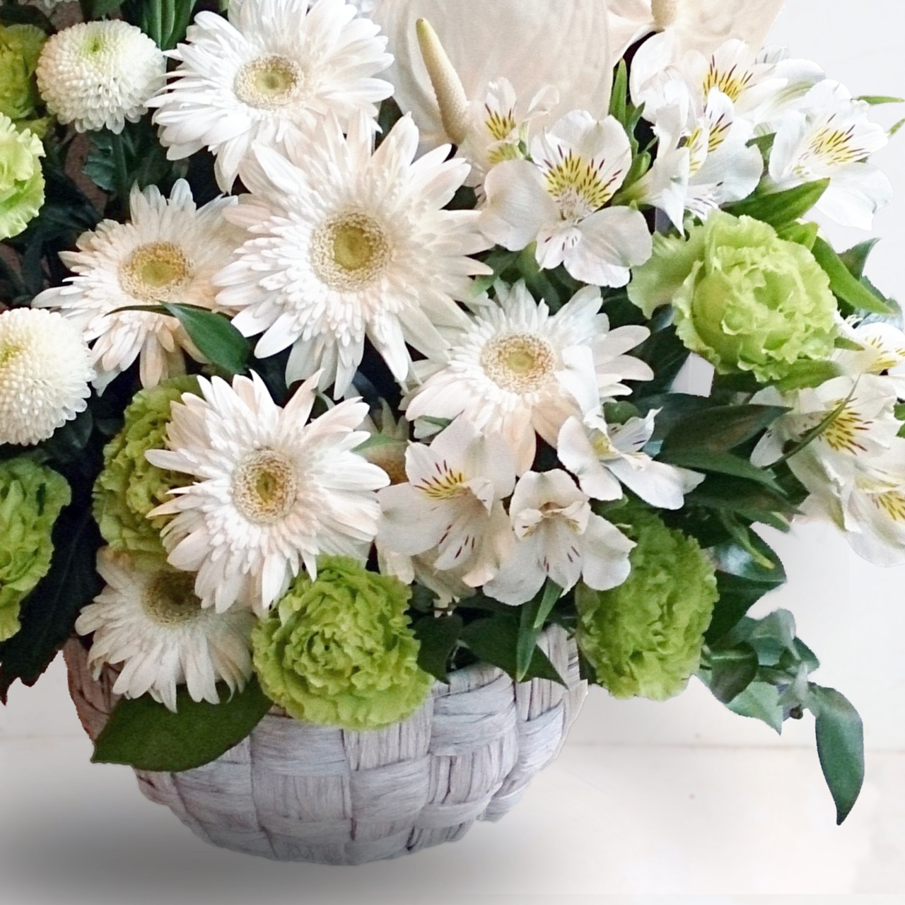 新鮮な白いガーベラとアンスリウムをふんだんに使用し、繊細さあふれるアレンジメントを実現しています。このアレンジメントで、大切な方へ寄り添う気持ちをお届けしましょう。