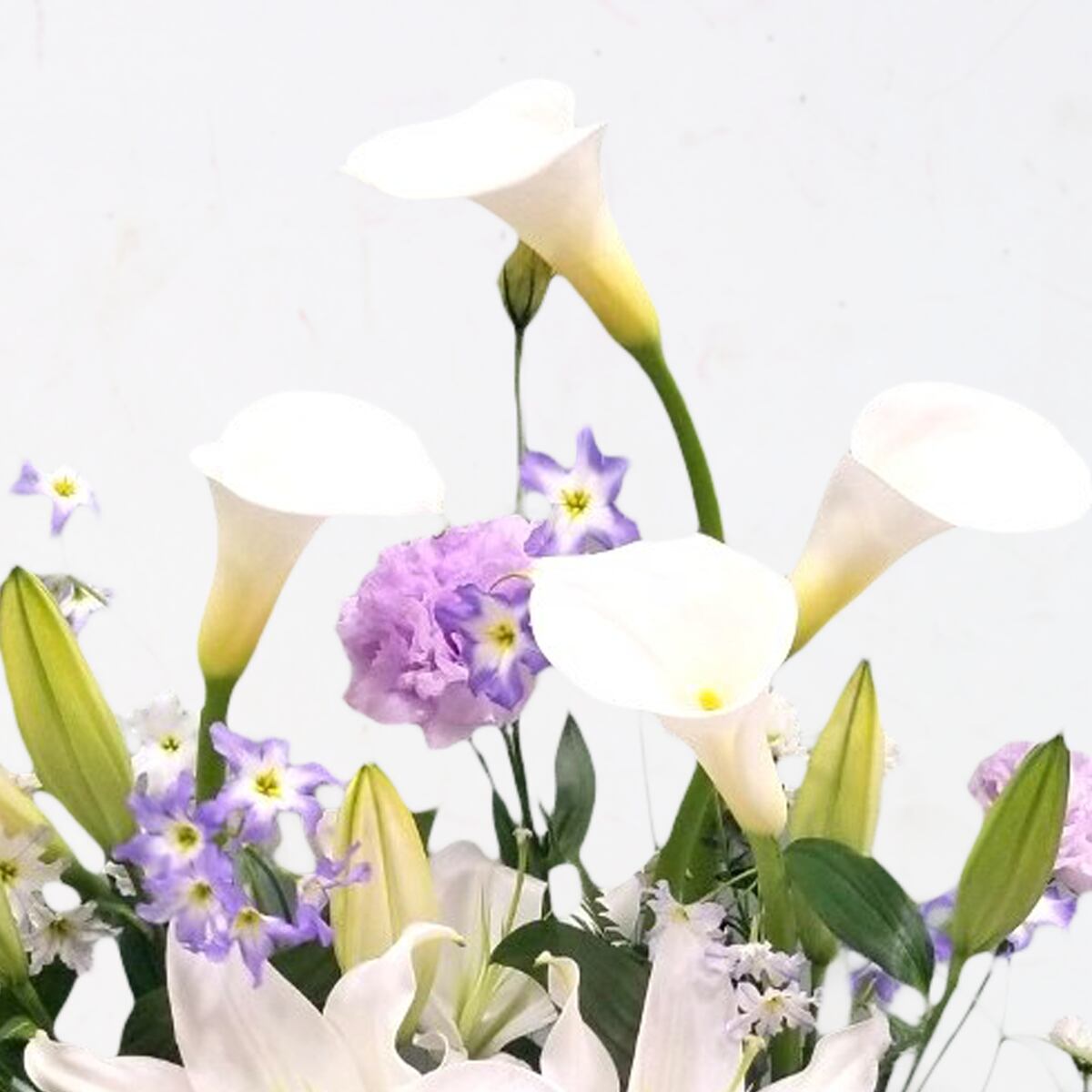 新鮮な白いユリ、カラー、そして紫のトルコギキョウをふんだんに使用し、繊細でありながら目を引くアレンジメントを実現しています。このアレンジメントで、故人に寄り添う思いをしっかりとお届けしましょう。