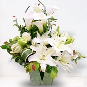 白いユリは「純粋」と「尊厳」を象徴する花です。その優雅な姿は贈られた方の心を静かに包み込み、故人への深い敬意を表現します。さらに、カラーの洗練された美しさと穏やかな緑のアクセントが加わることで、Lサイズのアレンジメントは圧倒的な存在感を持ちます。お悔やみや法要など、大切な瞬間でのご利用にふさわしい選択です。
