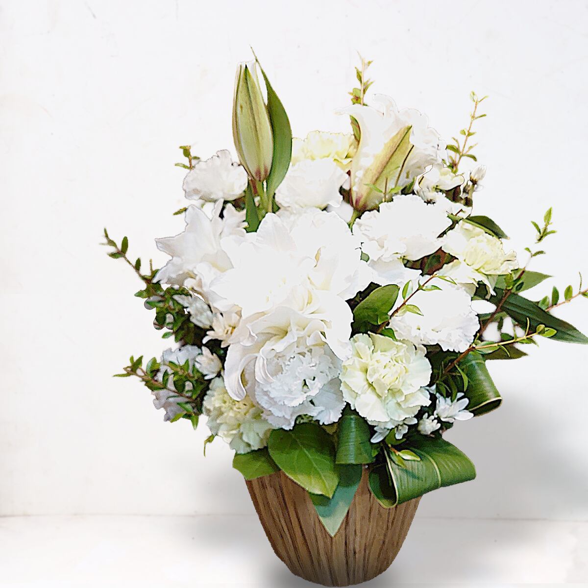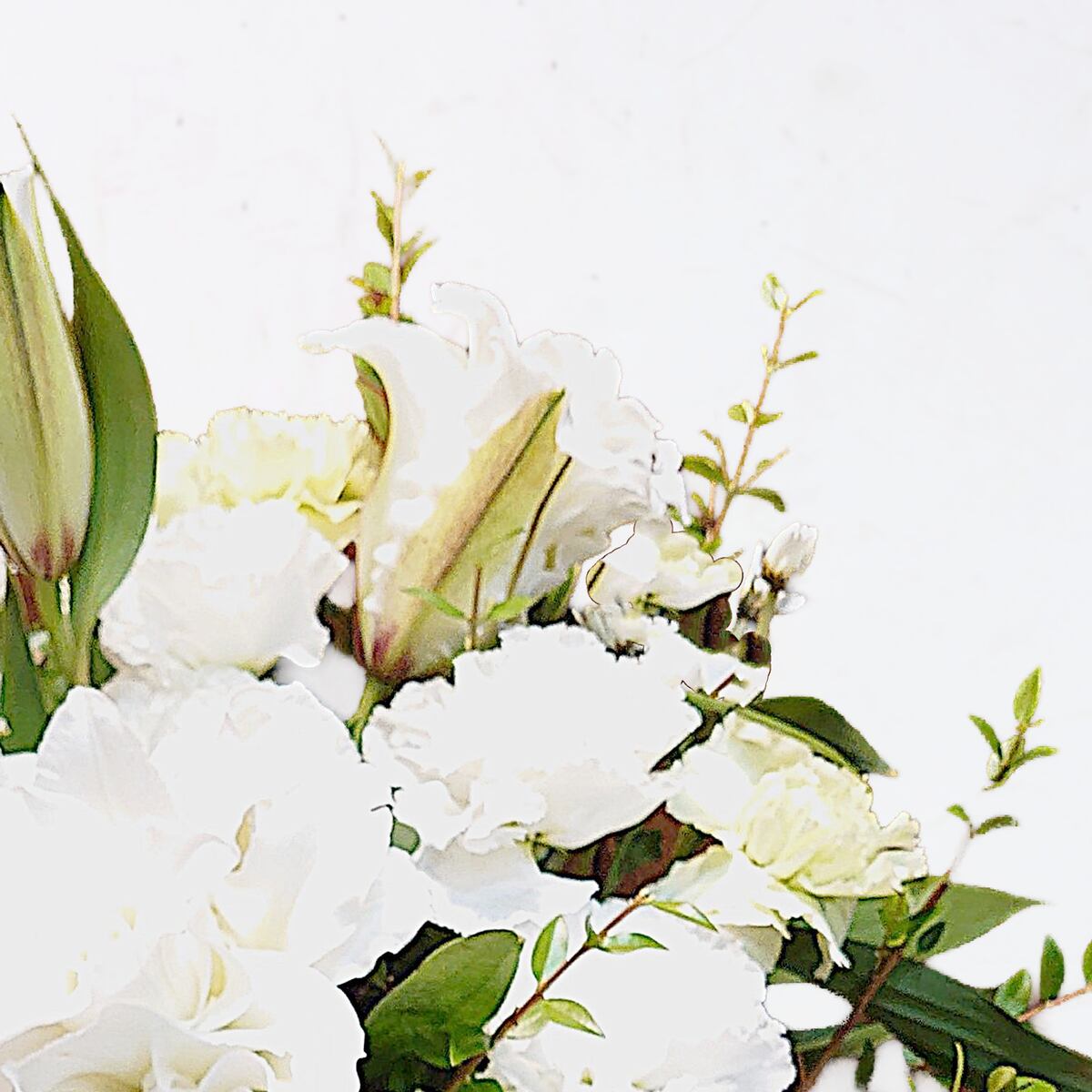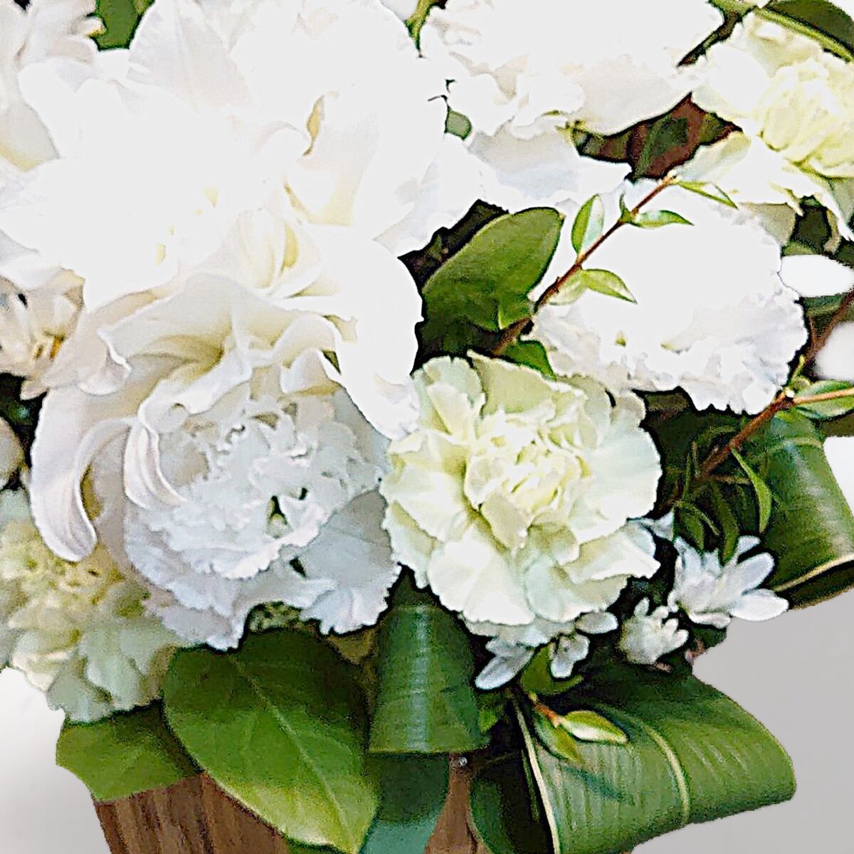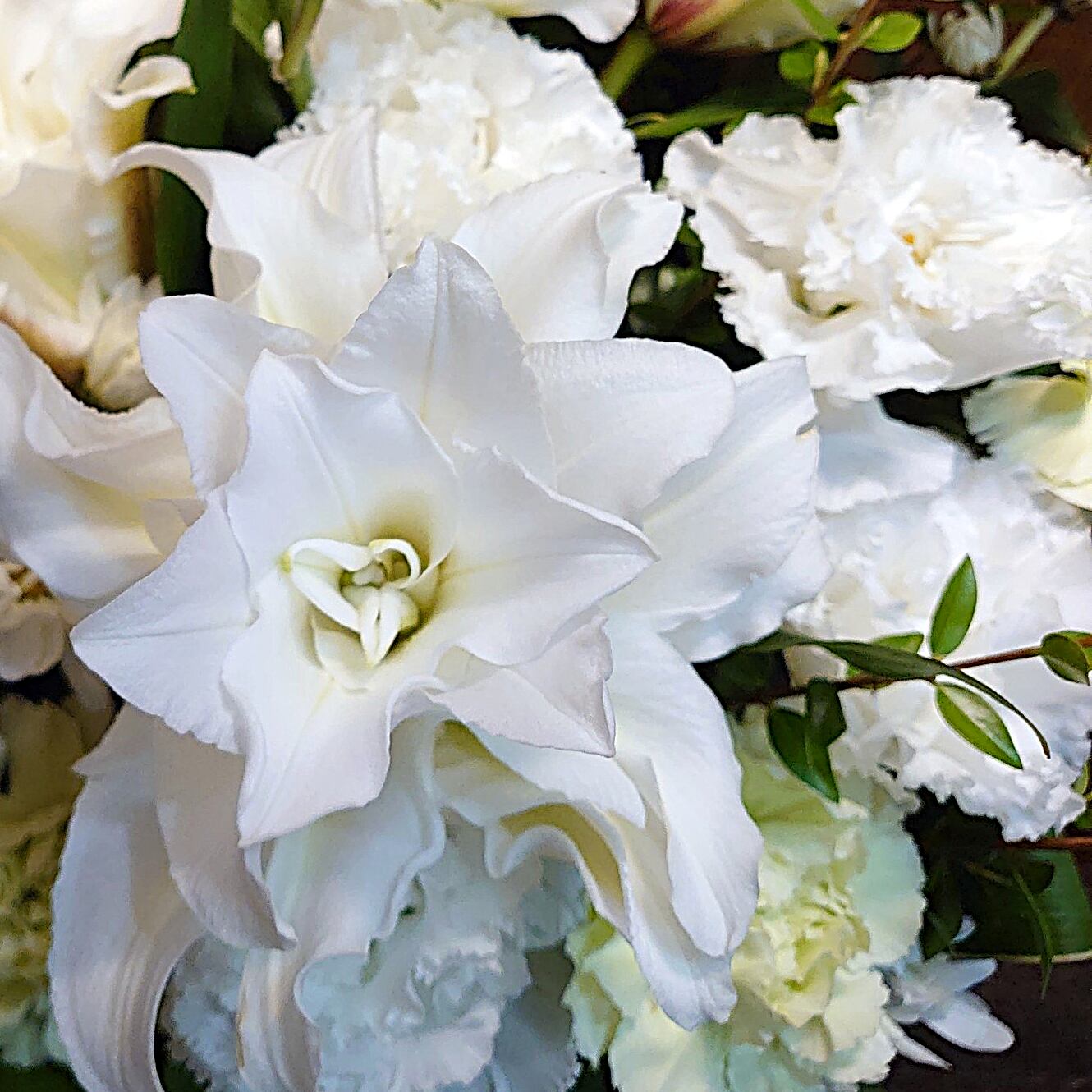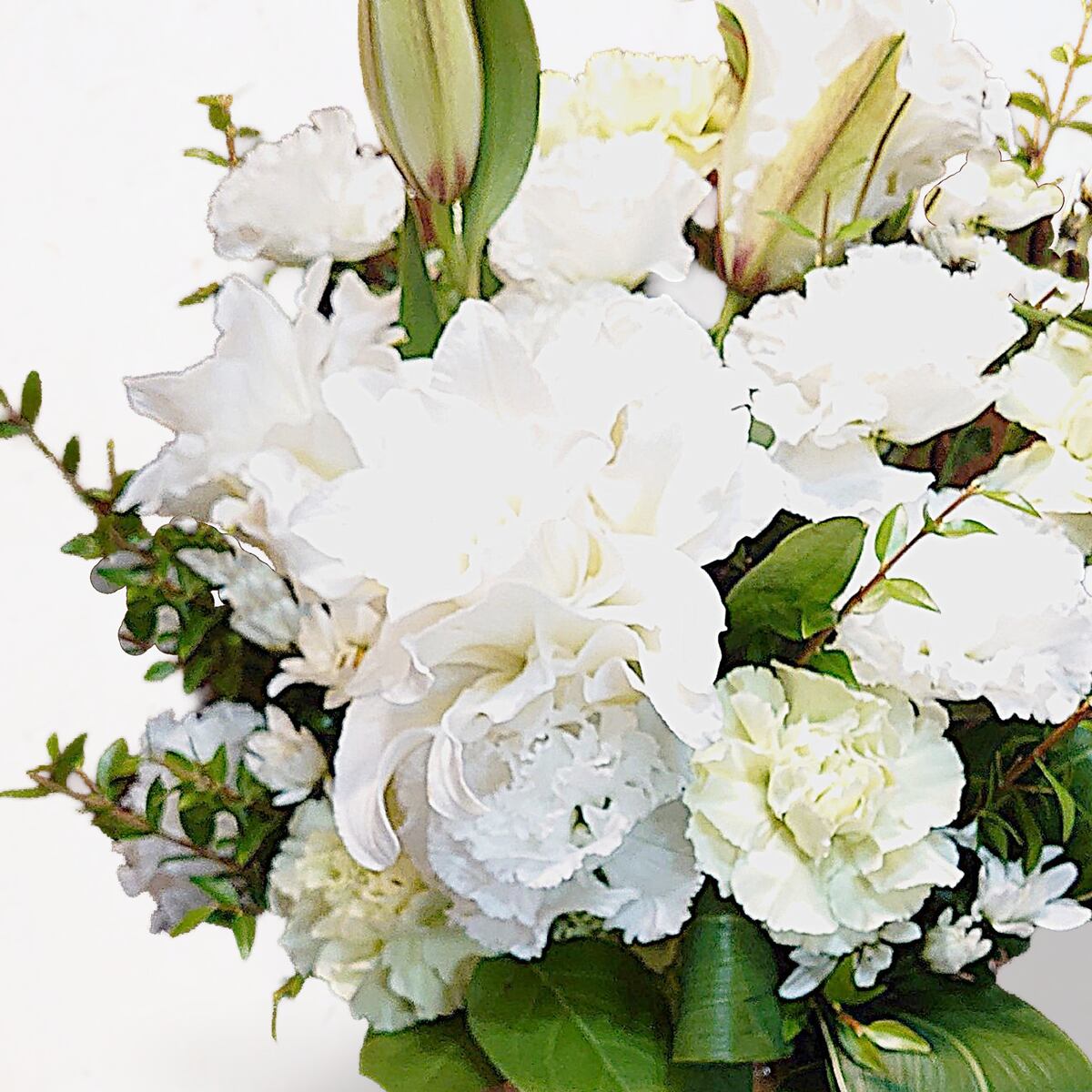 新鮮な白い八重咲のユリ、豊かな緑をたっぷり使用し、繊細でありながら目を引くアレンジメントを実現しています。このアレンジメントで、故人に寄り添う思いをしっかりとお届けしましょう。