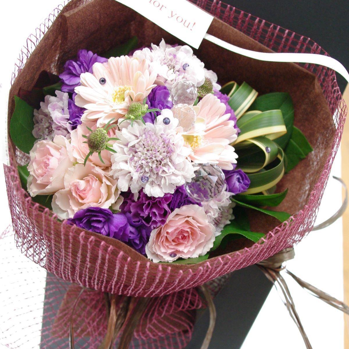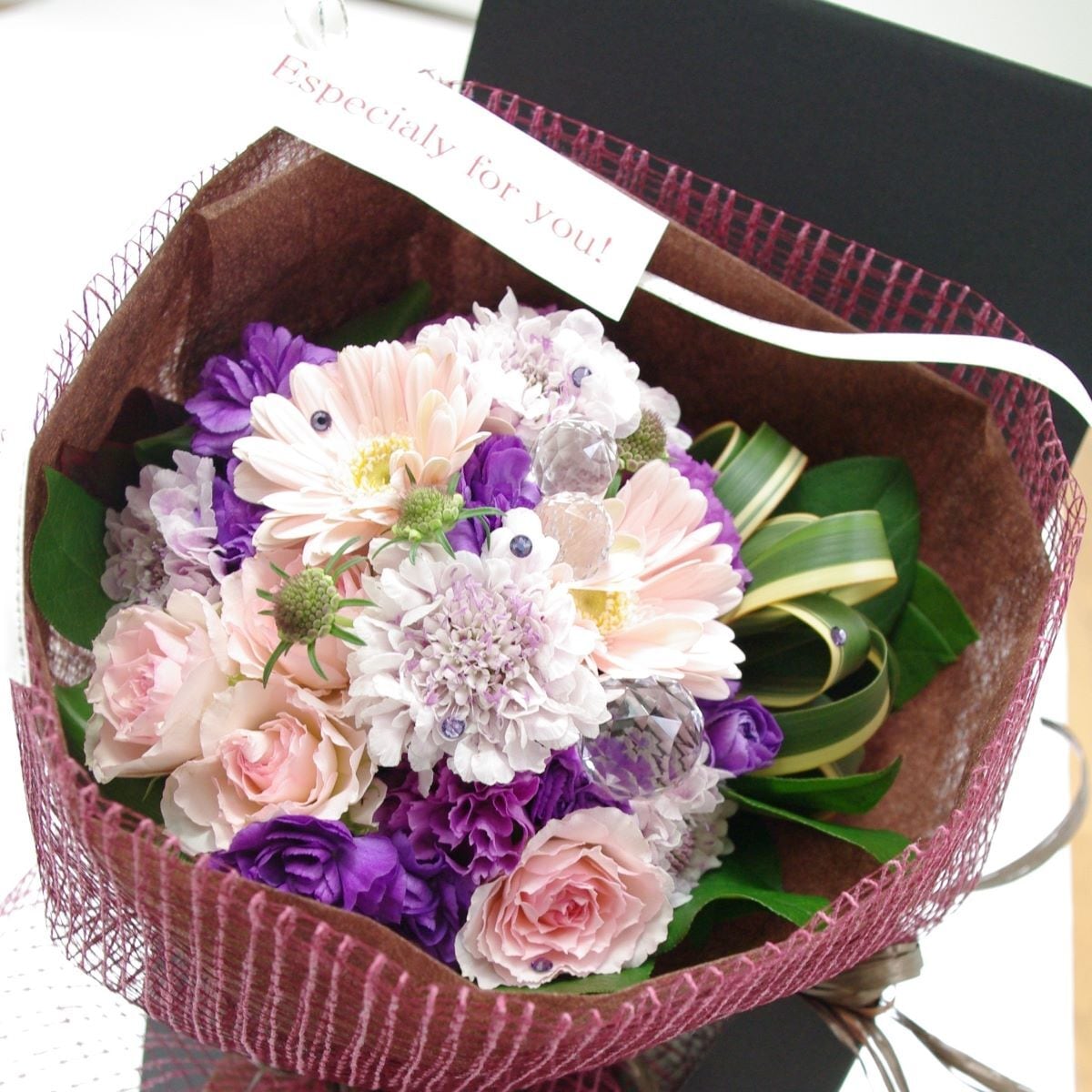 六本木・乃木坂エリアのフラワーショップ Flower shop KALIANg(カリアン) では、送別のシーンにふさわしい花束やフラワーアレンジを心を込めてお届けしています。写真の花束は、淡いピンクのガーベラとバラに、紫のトルコキキョウやスカビオサを合わせた上品で華やかなデザイン。やさしいピンクの花言葉には「感謝」「温かい心」、紫の花には「尊敬」「誇り」といった意味が込められており、これまでお世話になった方や新しい一歩を踏み出す方に贈るのに最適です。