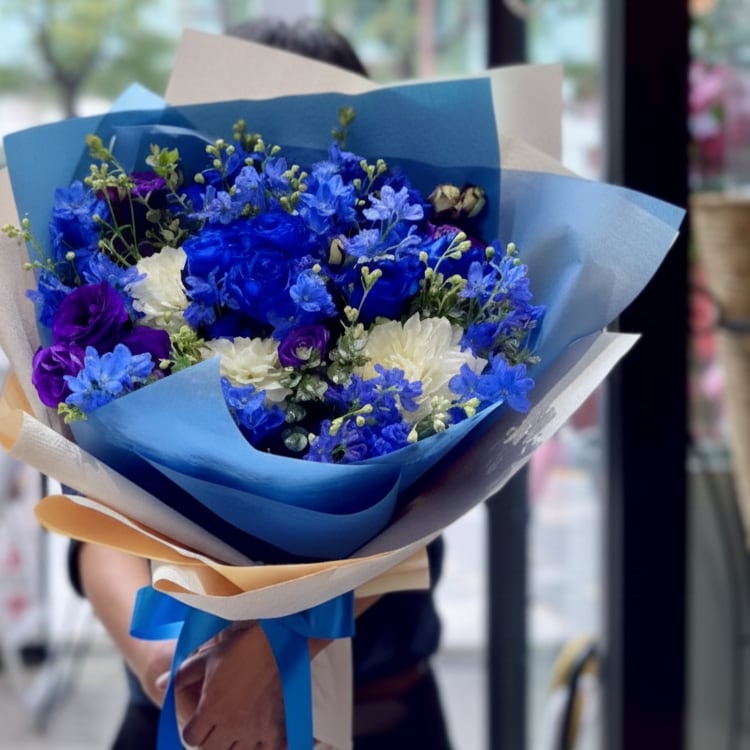 贈られたその瞬間から、心に残る素晴らしい思い出を作り出すことができます。厳選された青系の花を使用し、心を込めてお作りいたします。この美しい花束は、お祝いの場を華やかに彩る特別な贈り物として最適です。