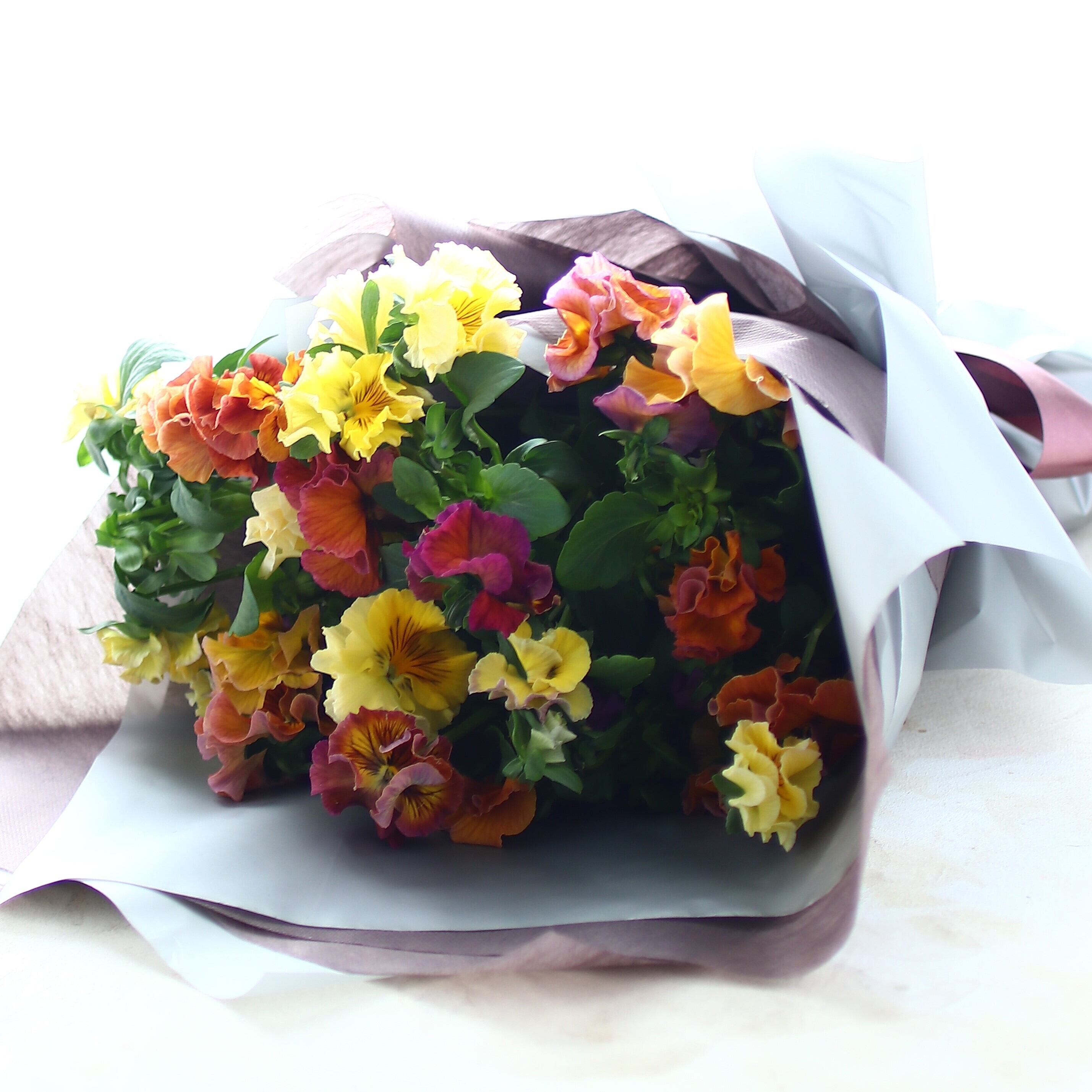 贈られたその瞬間から、心に残る特別な思い出を生むことができます。厳選されたパンジーを使用し、心を込めてお作りいたします。この美しい花束は、特別な日の贈り物として最適です。