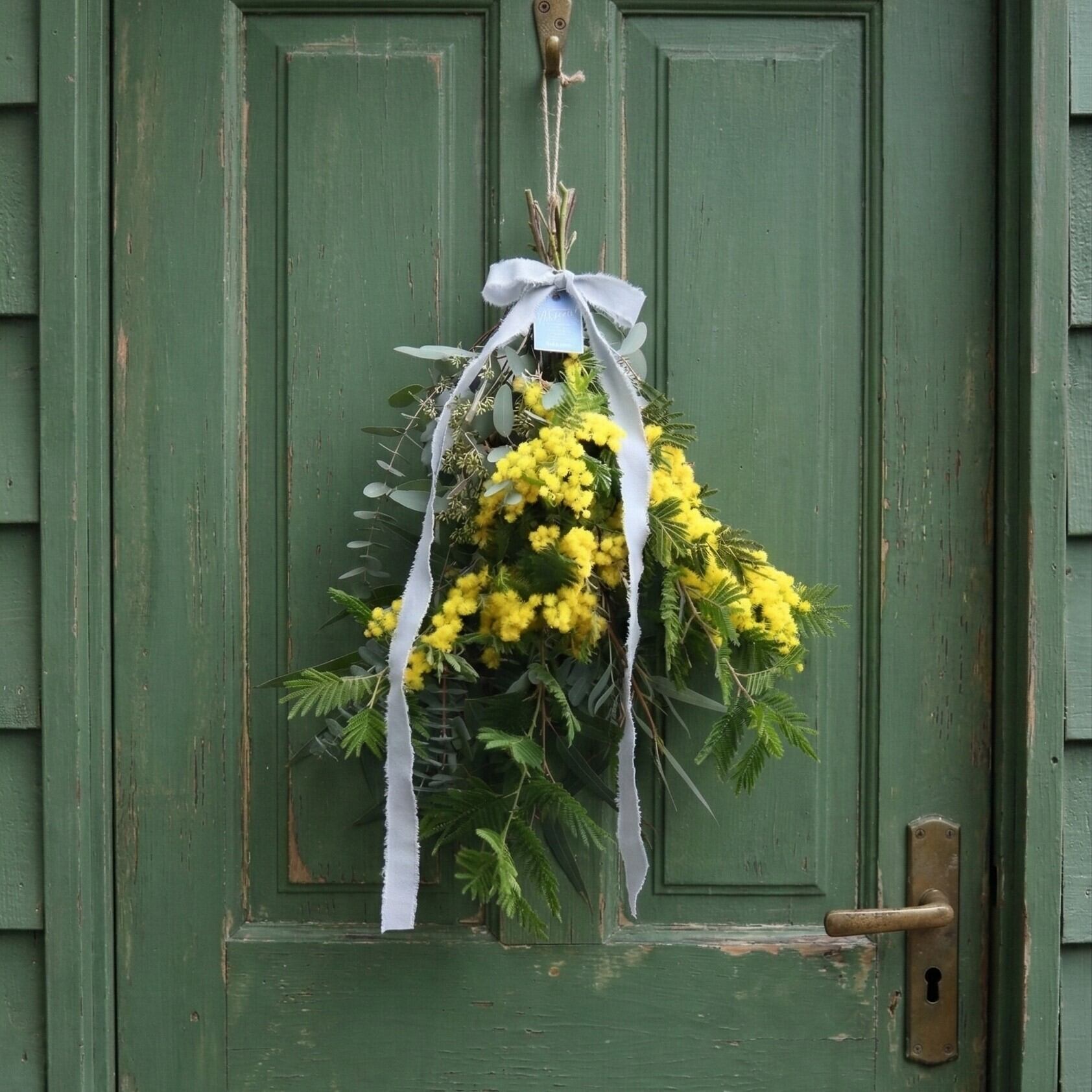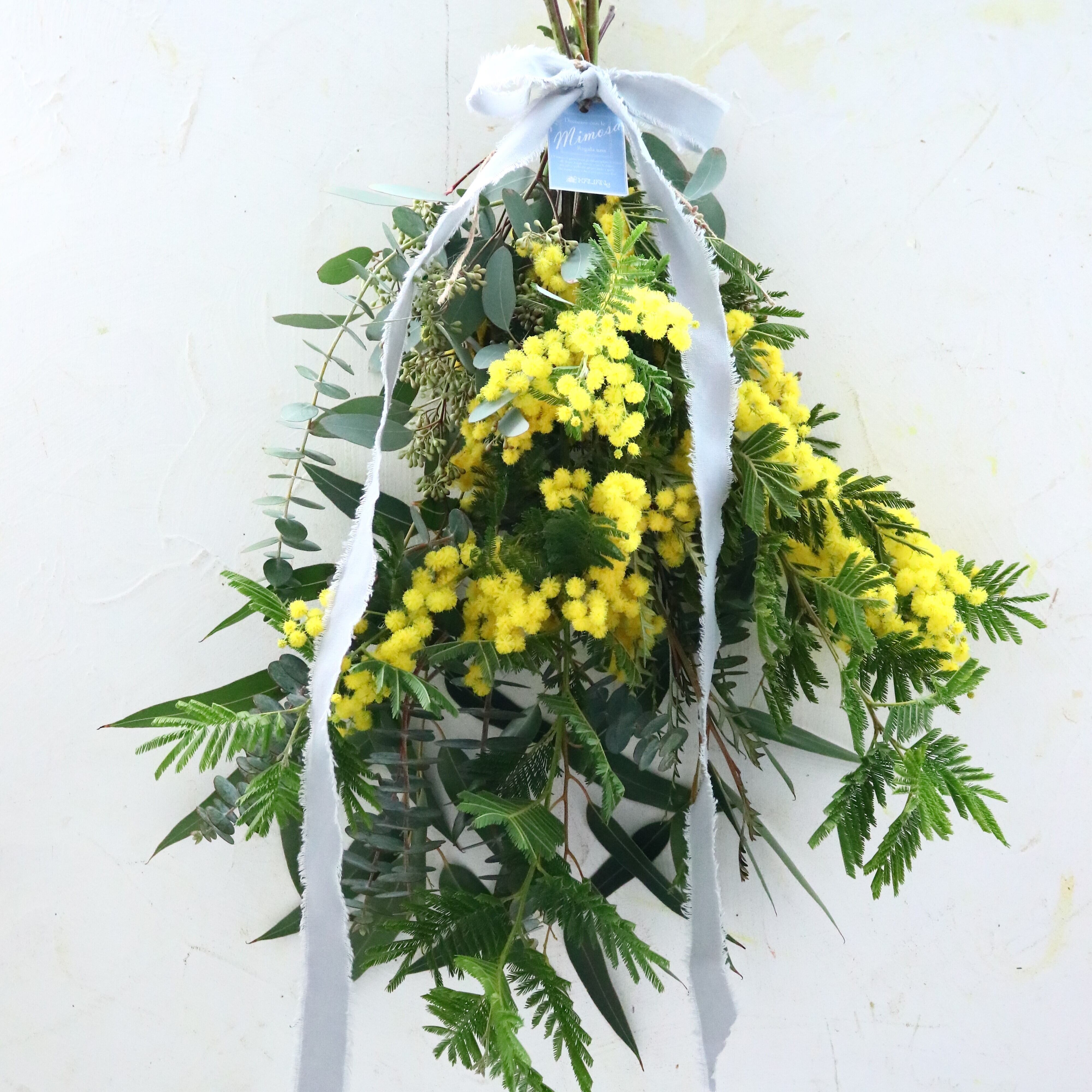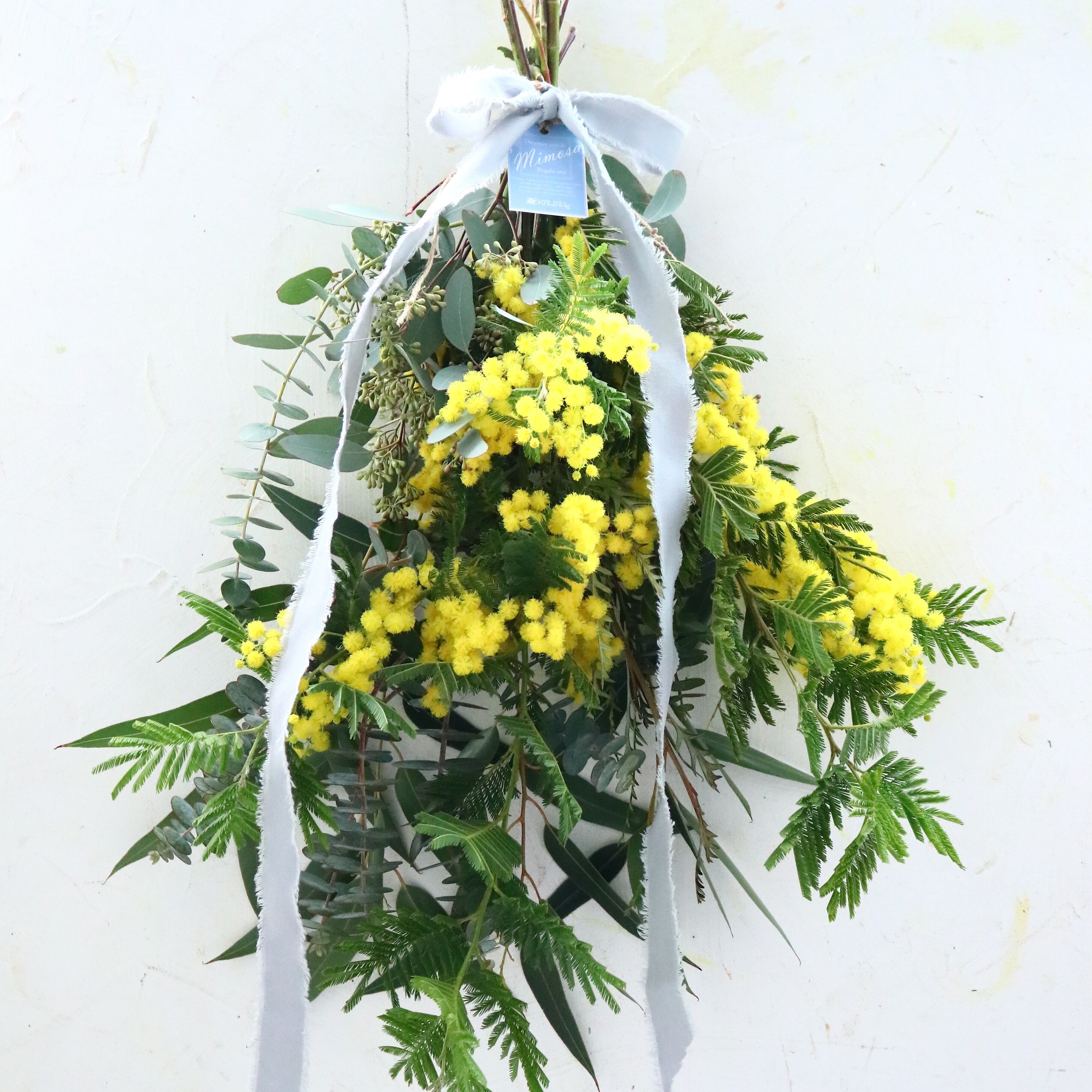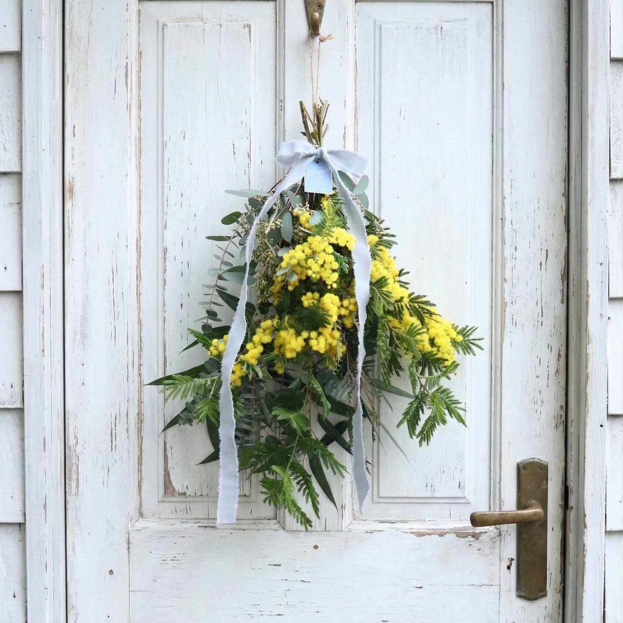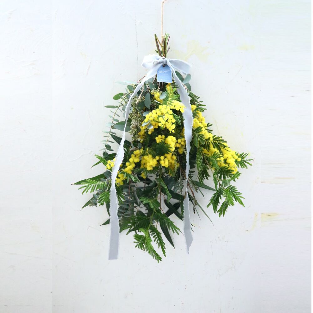 贈られたその瞬間から、心に残る特別な思い出を築いていただけることでしょう。厳選されたミモザを使用し、心を込めてお作りいたします。この美しいスワッグは、感謝の証として最適なギフトです。
