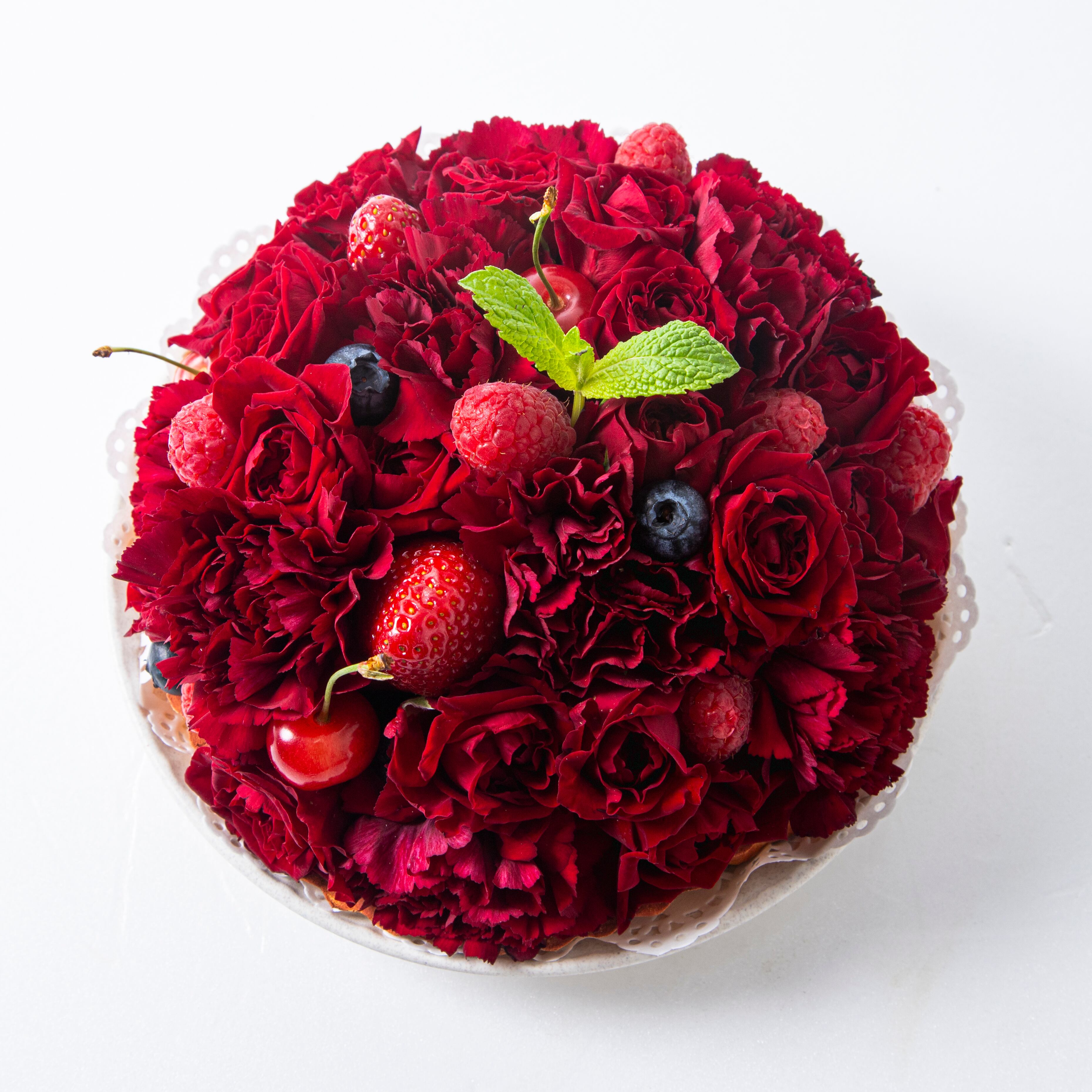 メインに使用するのは、圧倒的な存在感を放つ赤バラです。情熱、愛情、感謝の象徴であるバラを贅沢に使い、花びらの重なりが魅せる陰影で、ベリーのムースやクリームのような柔らかい質感を表現しました。