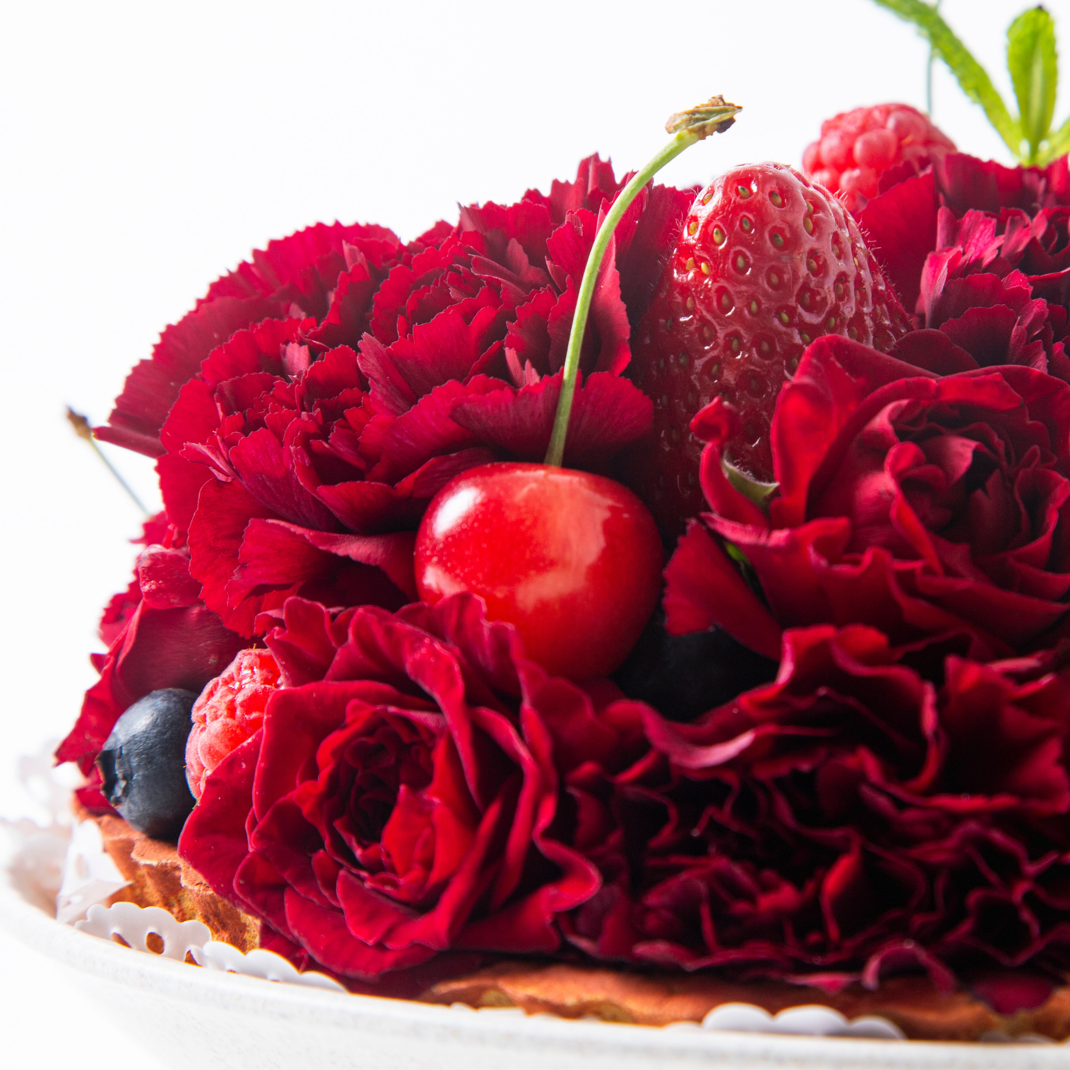 イチゴの鮮やかな赤、艶やかなチェリー、深い色味のブラックベリー。バラの赤と果実の赤が響き合い、思わず手に取りたくなるような瑞々しいリアリティを生み出しています。
