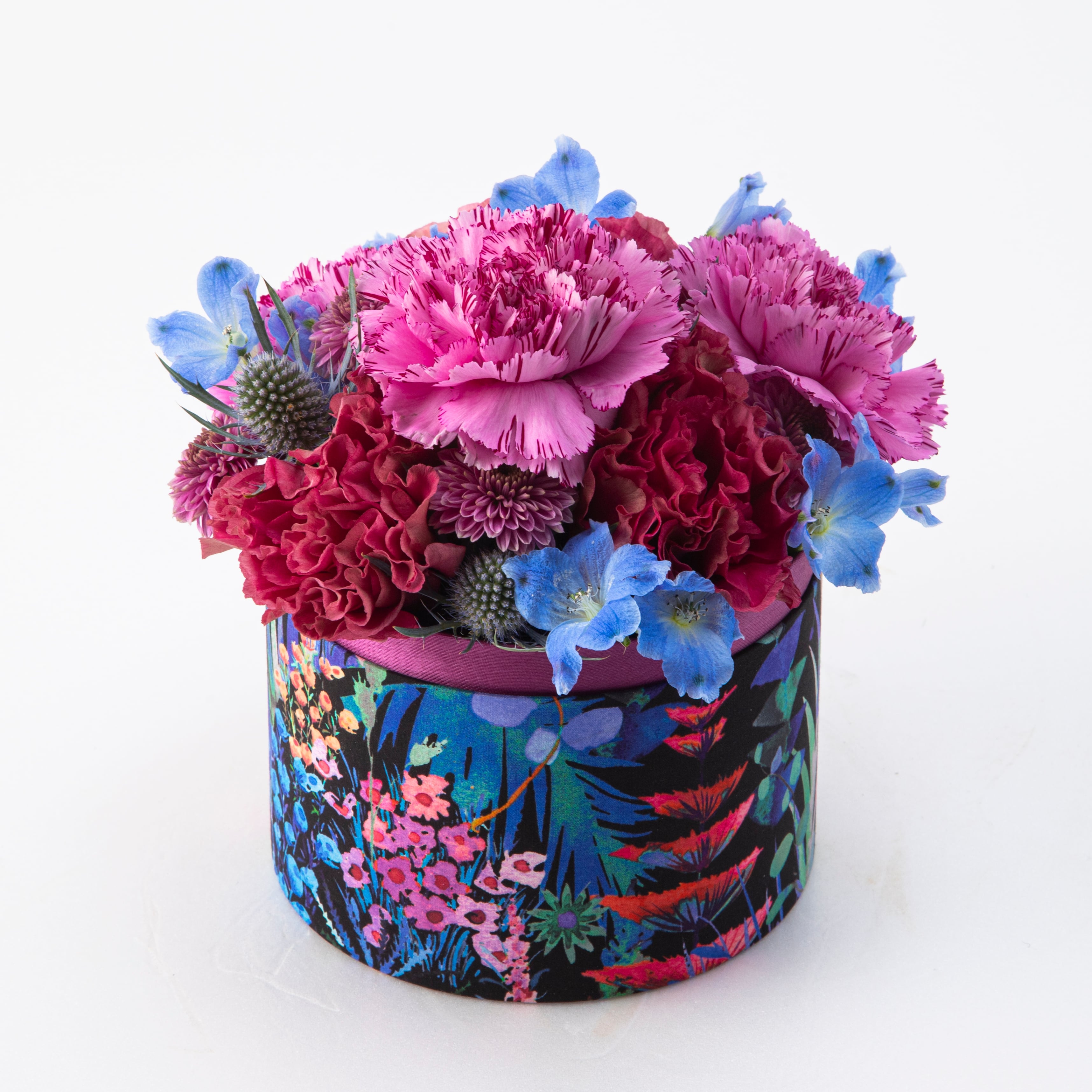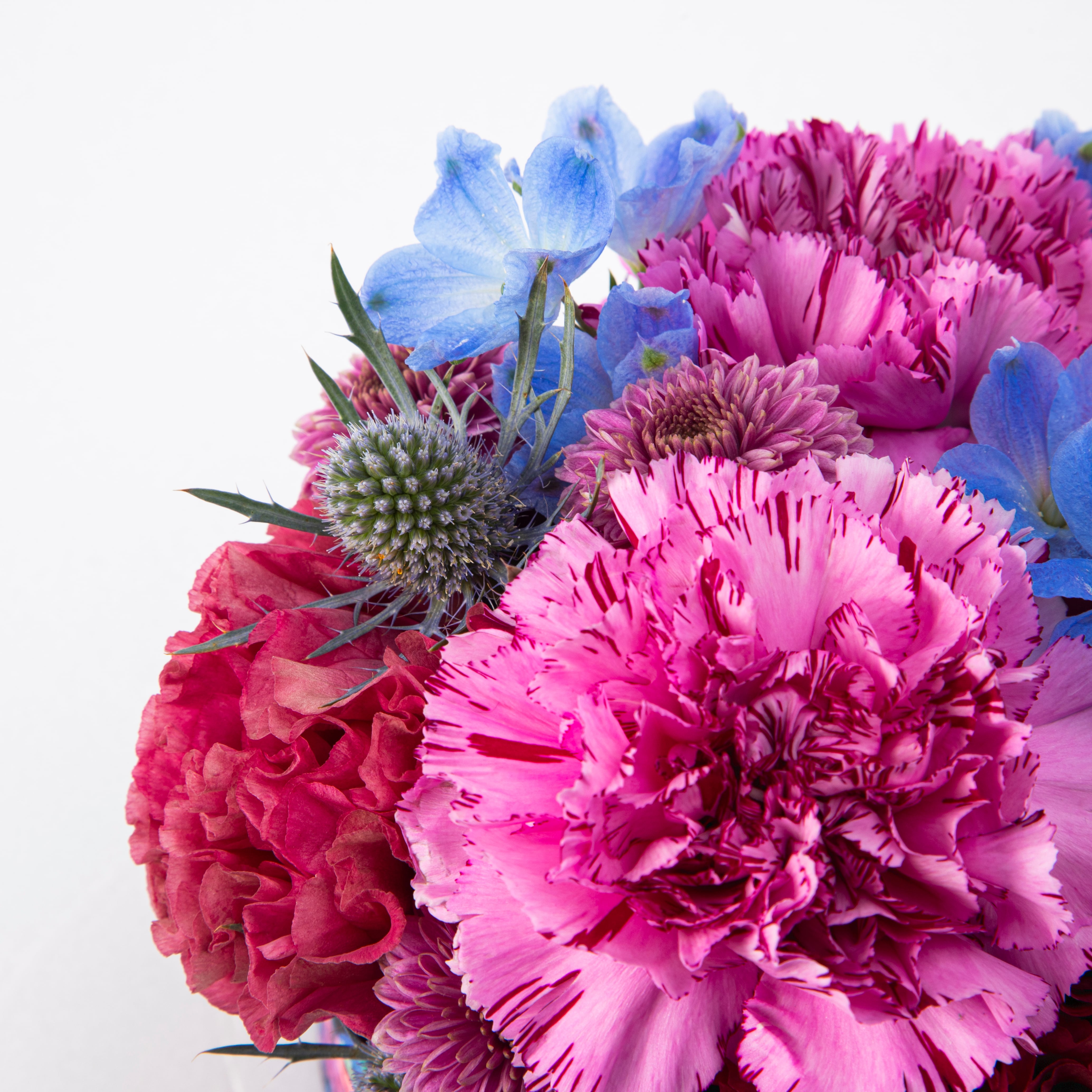 季節の生花: 高品質な青いバラとピンクのカーネーションを使用し、魅力的で優雅な印象を与えています。