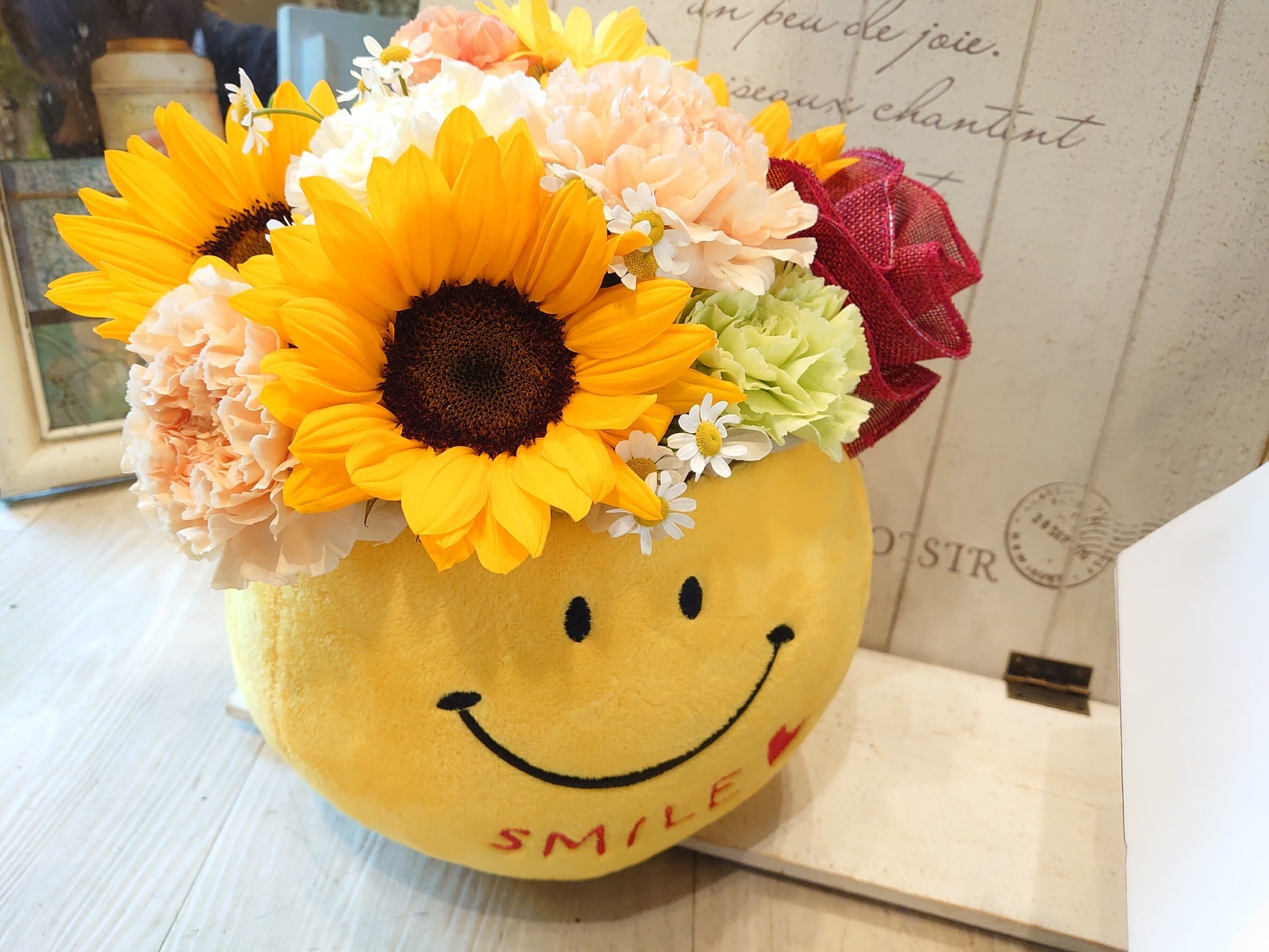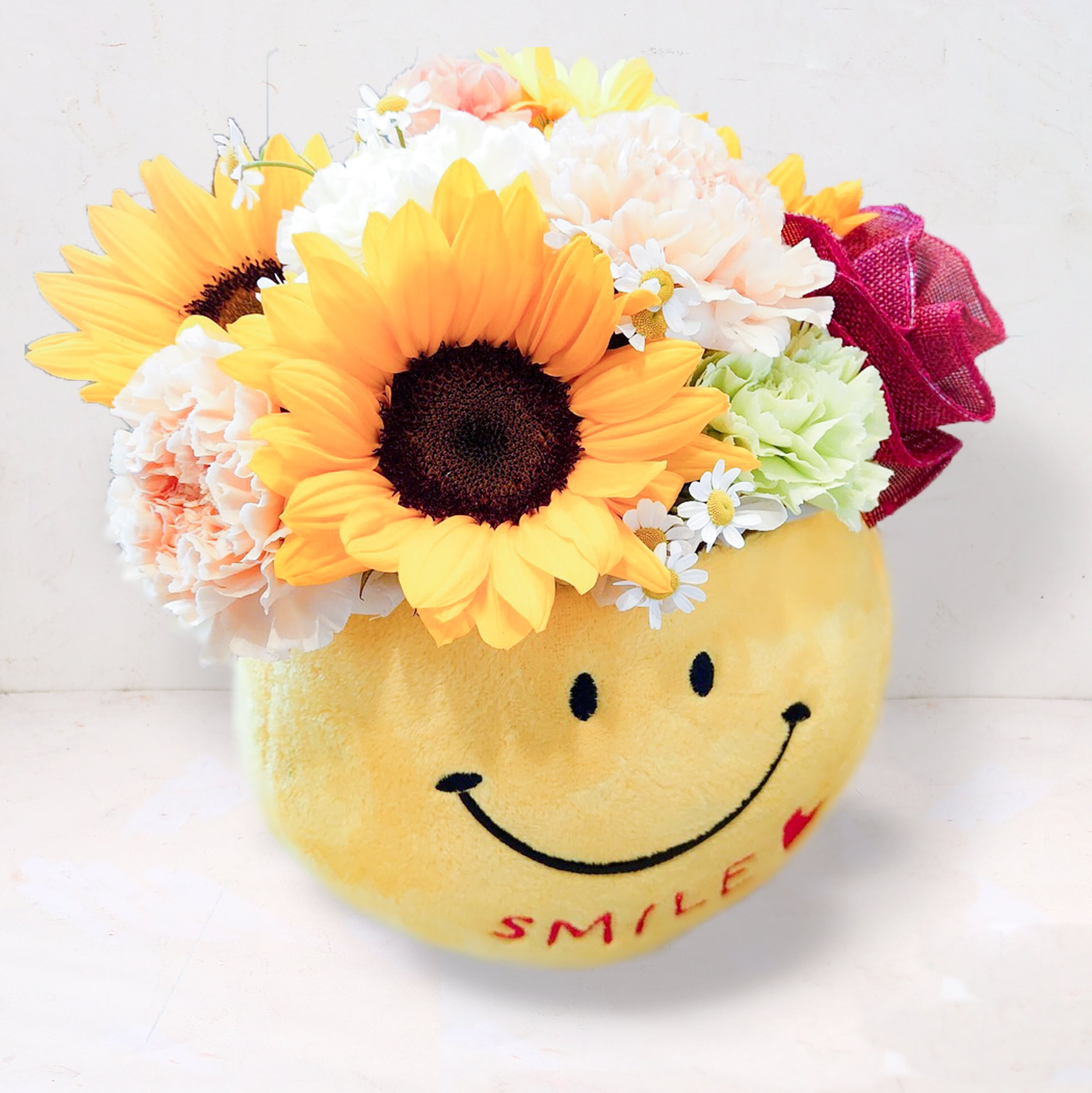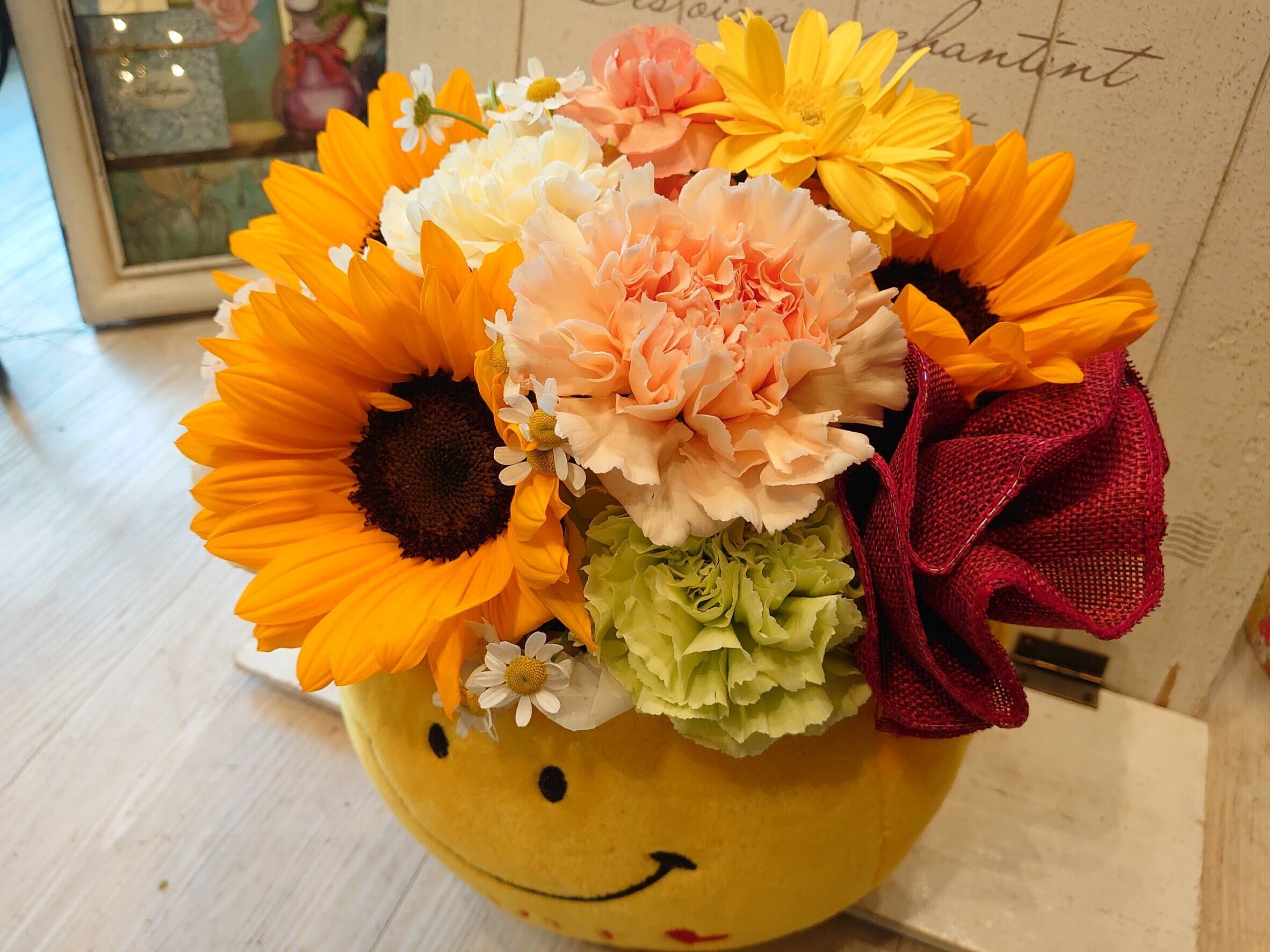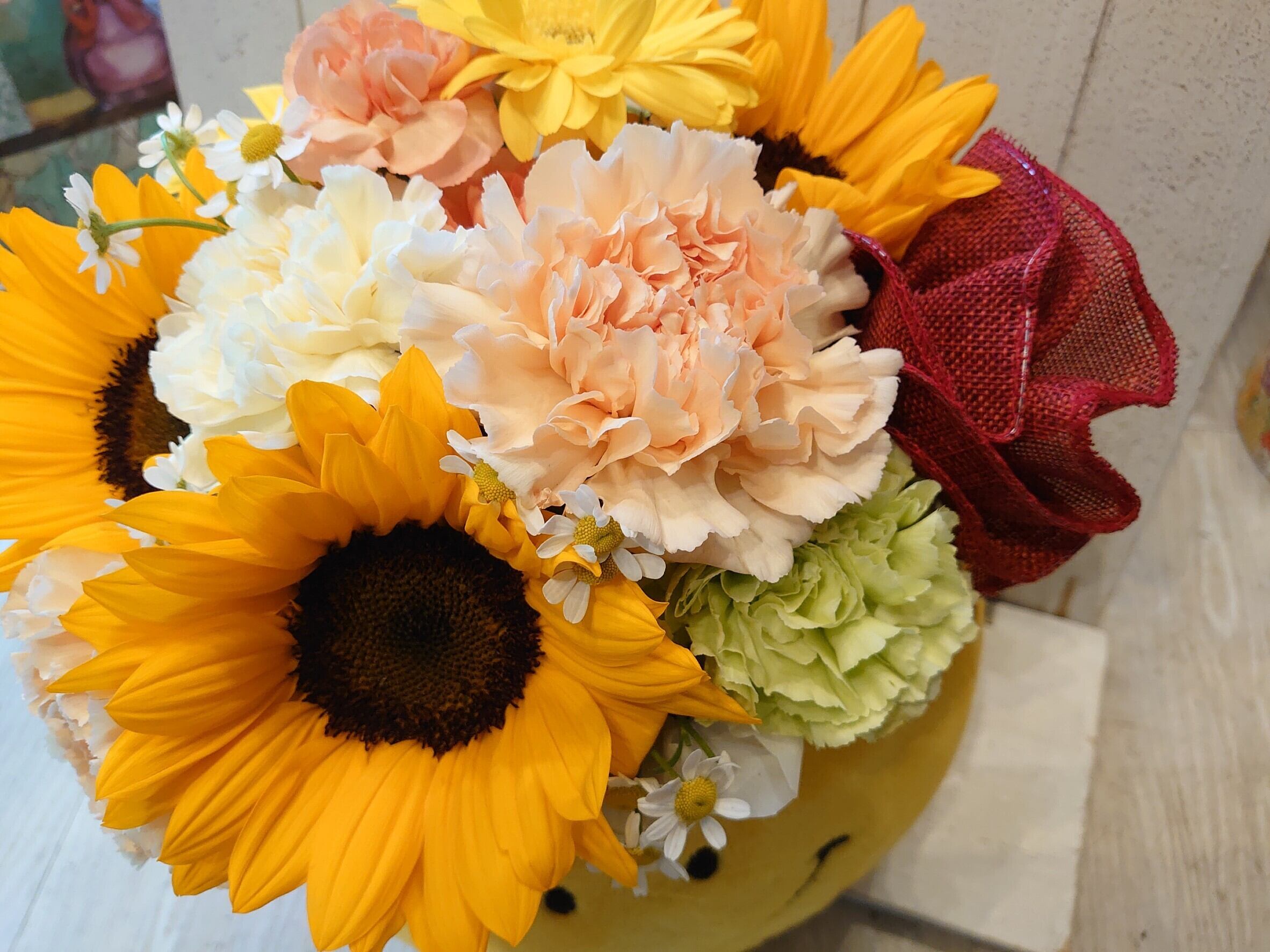 花材:カーネーション・ヒマワリ・季節のお花とグリーン