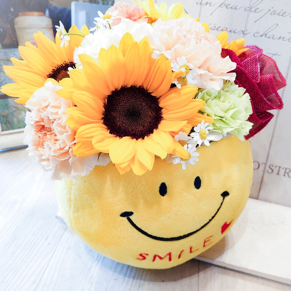 母の日 アレンジメント「母の日のイエローニコちゃんのアレンジメント」Mother's Day イエローオレンジ系 カーネーション ひまわり ヒマワリ にこちゃん
