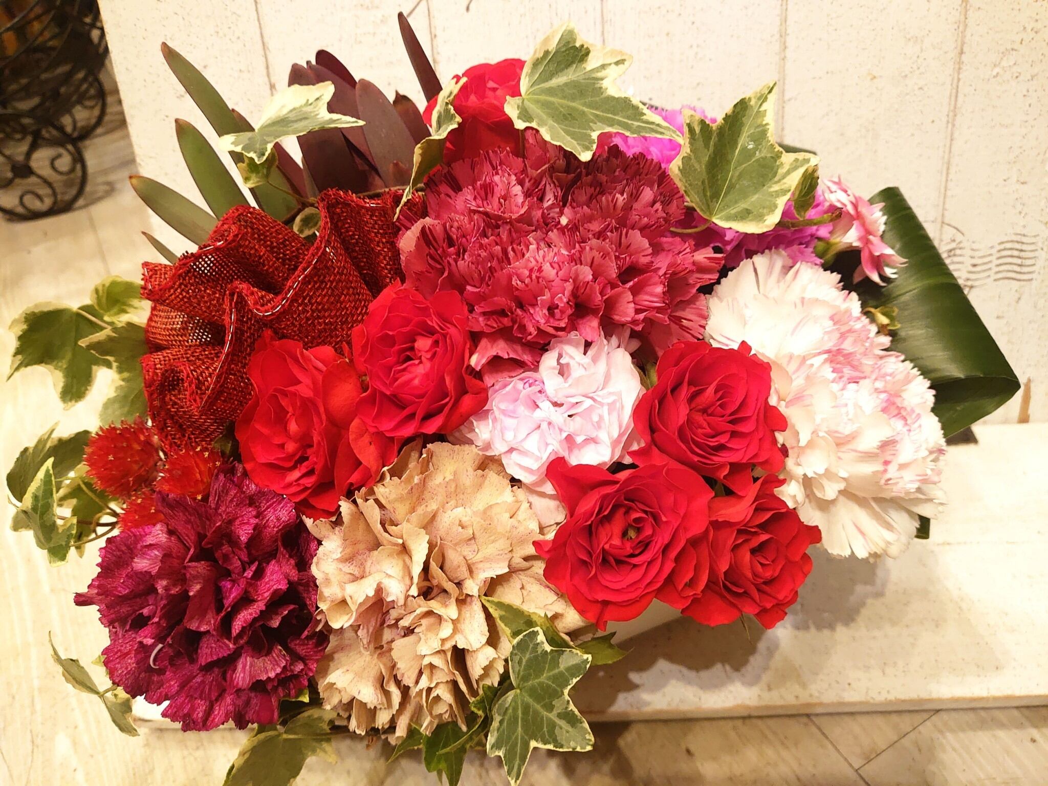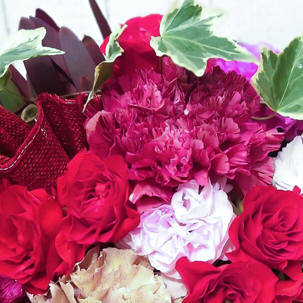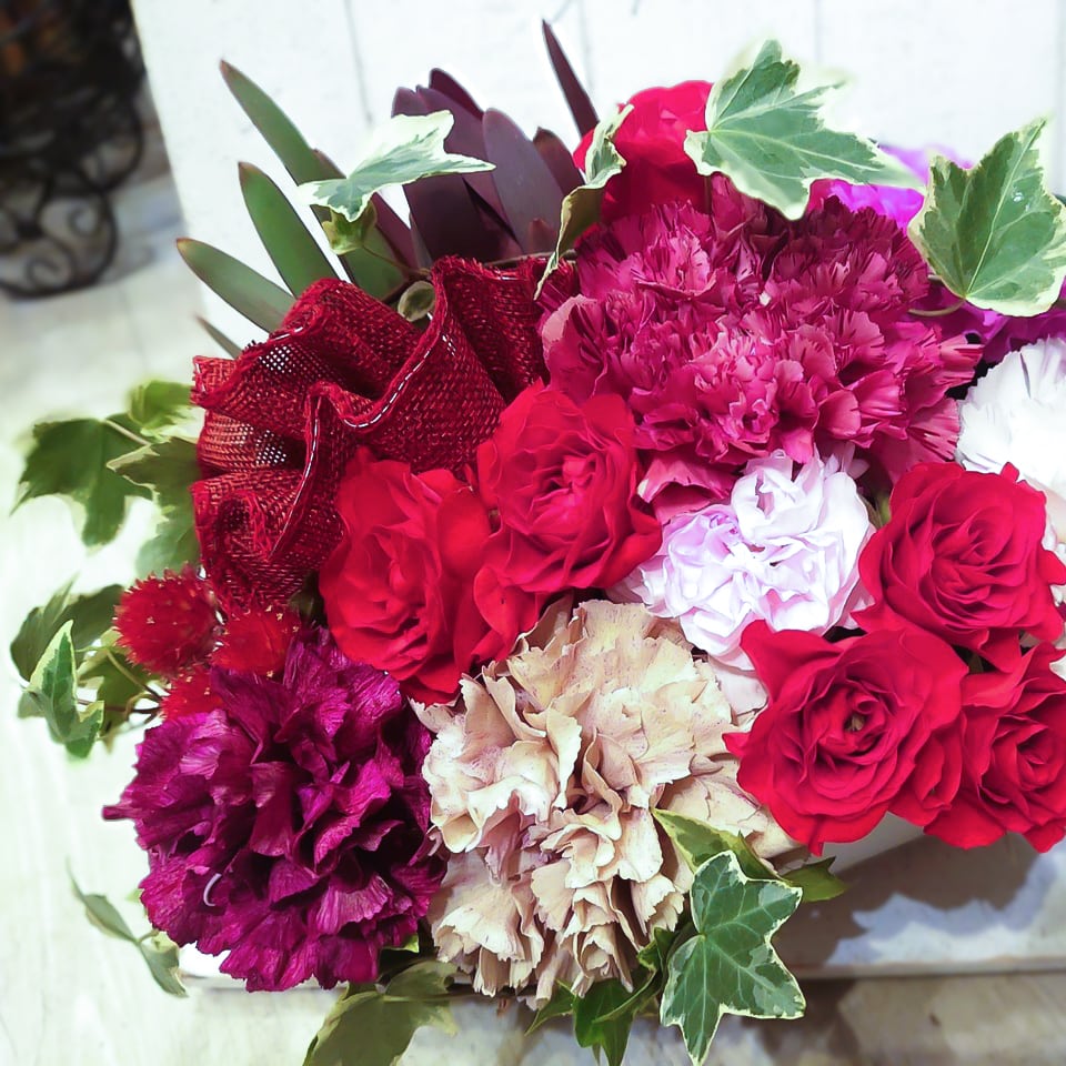 カーネーションをメインに赤やピンクのお花を使ってエレガントにお作りいたします(^^♪