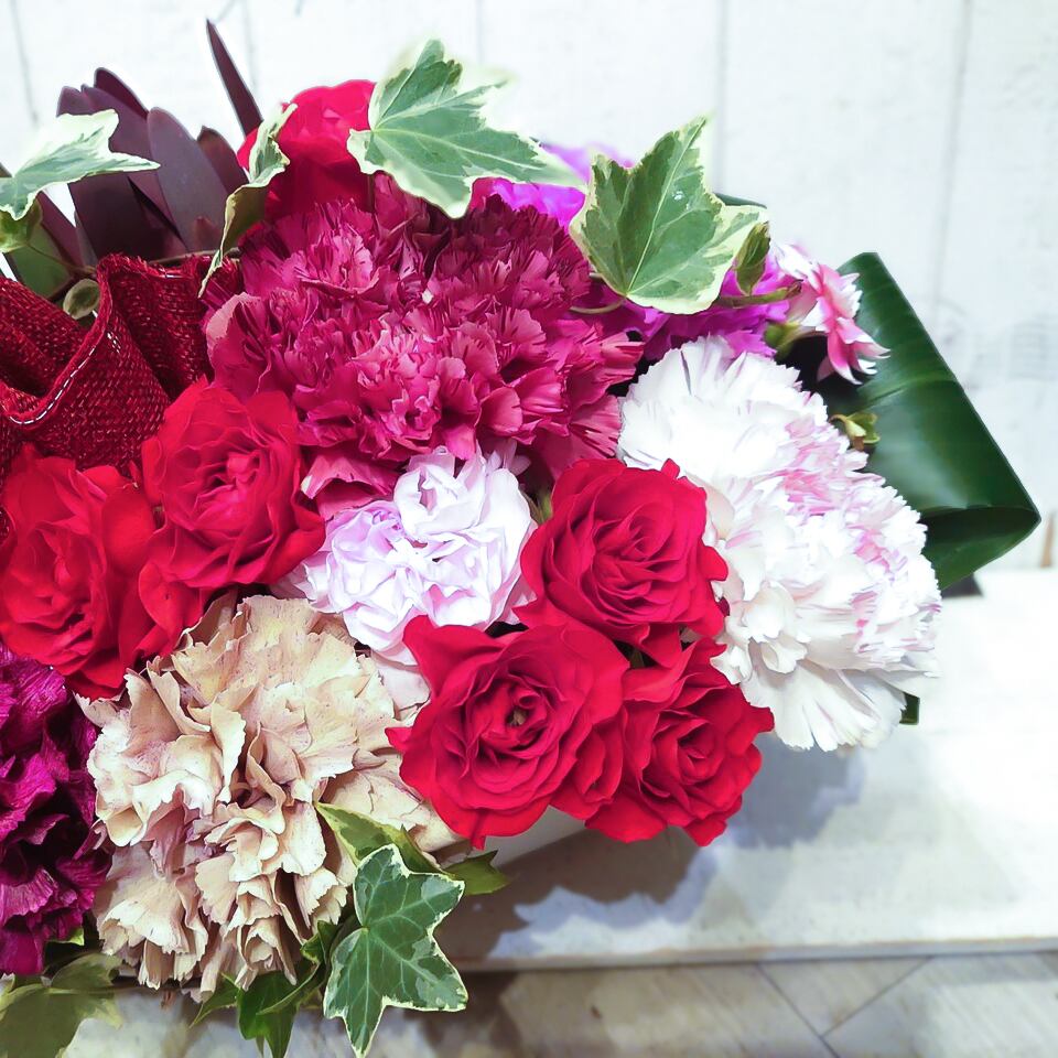 カーネーションやバラの生産状況によりボリュームが変わることがあります。生花という商品の性質上、輸送上の転倒・破損以外での返品や交換はできませんので、あらかじめご了承ください。すべての注文は都度の手作りとなり、全く同じものにはなりません。花の種類は季節によって異なることがありますので、予めご了承下さい。花の種類は気候変動などによって異なることがありますので、その点もご理解いただけますようお願いいたします。
