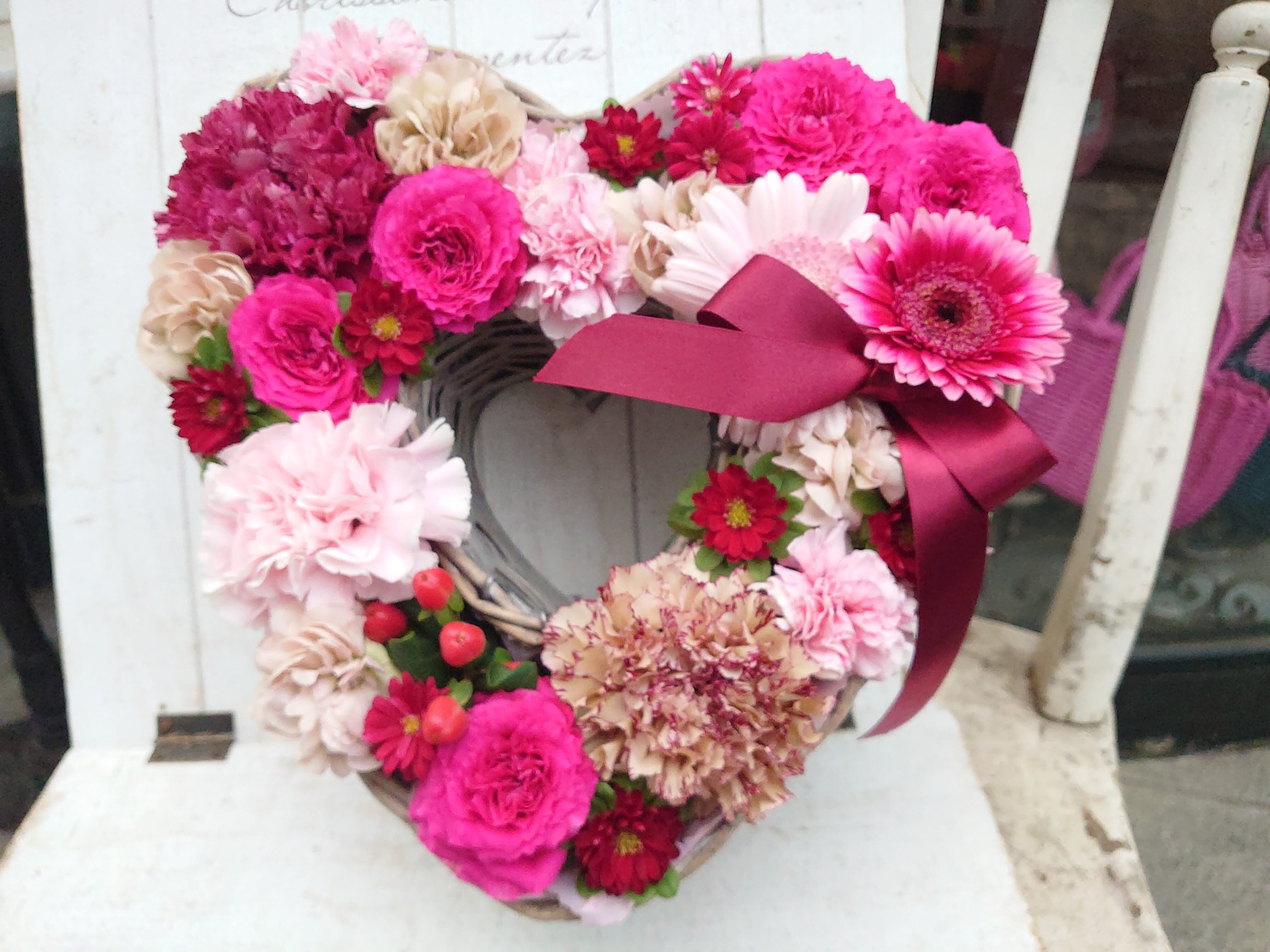かわいいハート型のバスケットにお花をギュッと詰めて、カーネーションとバラをメインにお作りいたします♪♪