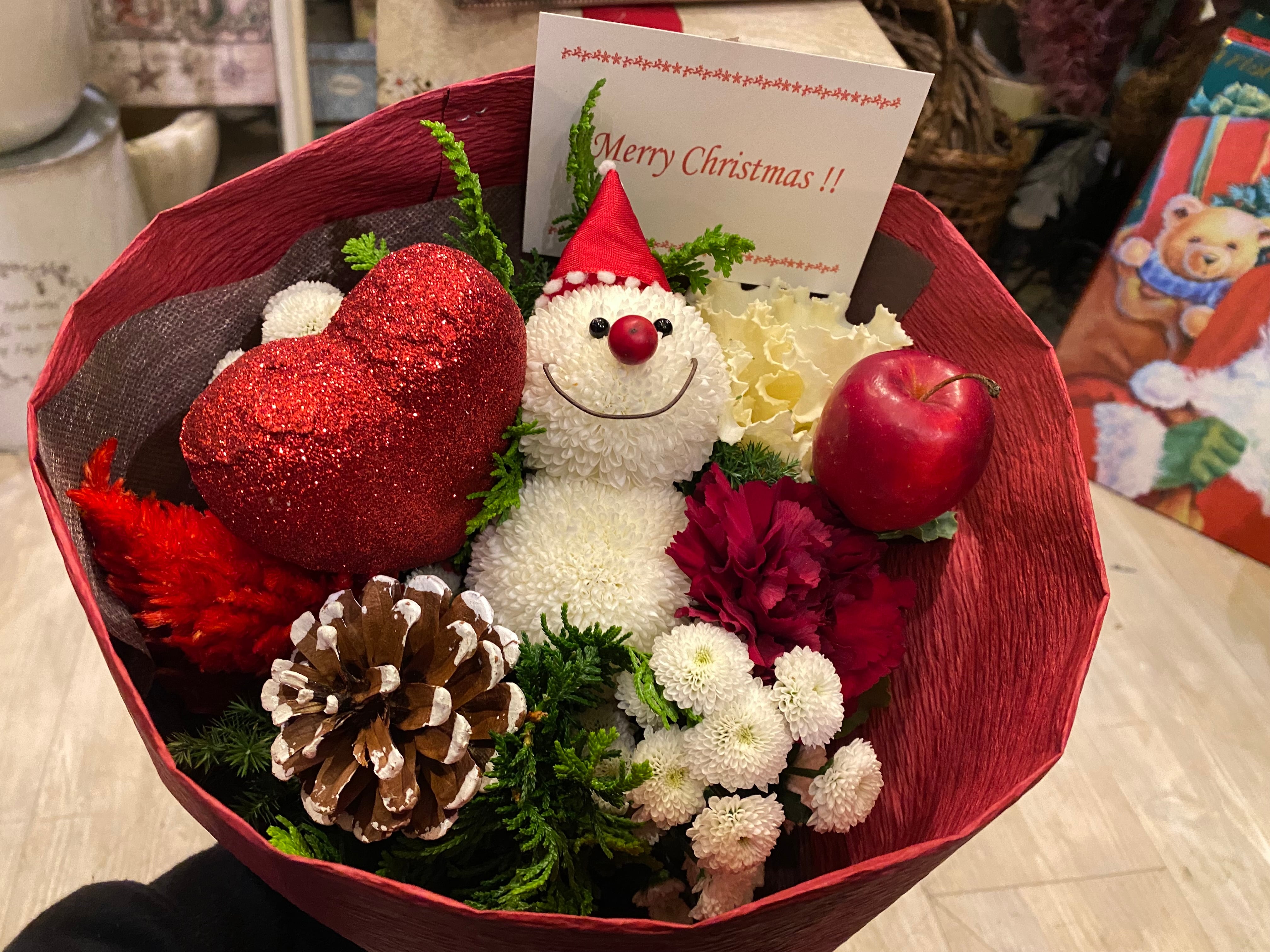 お花の組み合わせについては、赤と白のミックスでおまかせとなりますのでお花の種類等はご指定できません。スノーマンは手作りのため表情に違いがあります。お花につきましては、生花という性質の商品につき返品などはできません。枯れ・痛み等につきましてはお届け時にお申し出ください。お届け後のお申し出は承れない場合がございます。生花であるため、花の種類やボリュームは季節や生産状況により異なる場合があります。ご指定はできません。ご理解いただきまして、ご注文をお願いいたします。