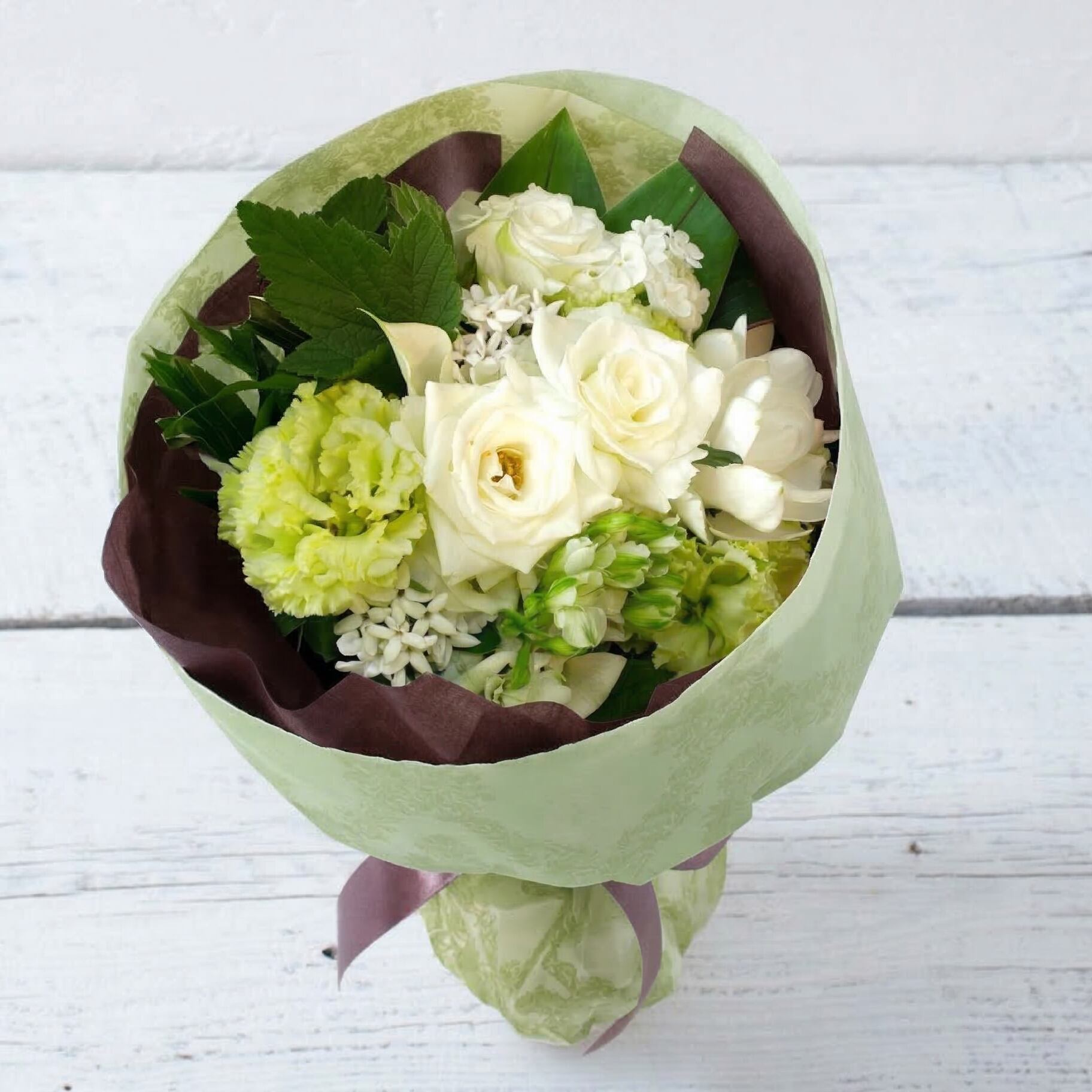 当ショップは「上質に、少しの遊び心を。」をコンセプトに、皆様に極上の花と素晴らしい瞬間をお届けいたします。この機会にぜひ、この「ホワイト・グリーン 旬のおまかせブーケ【Lサイズ】」で特別な時間を彩りましょう!