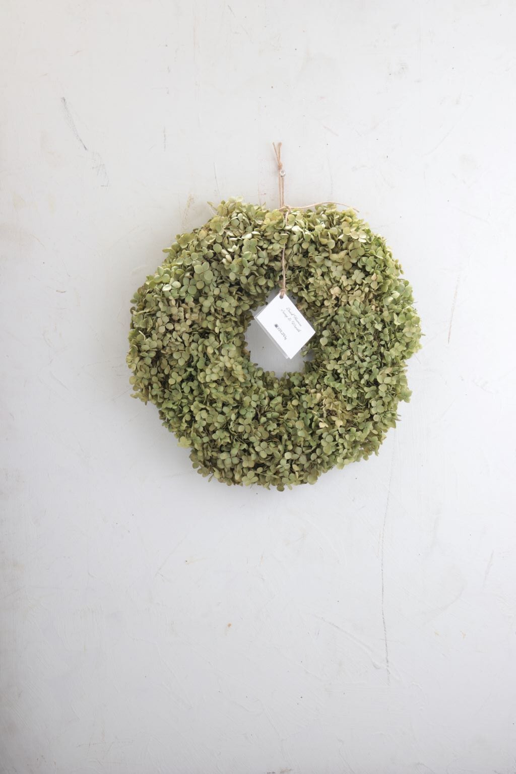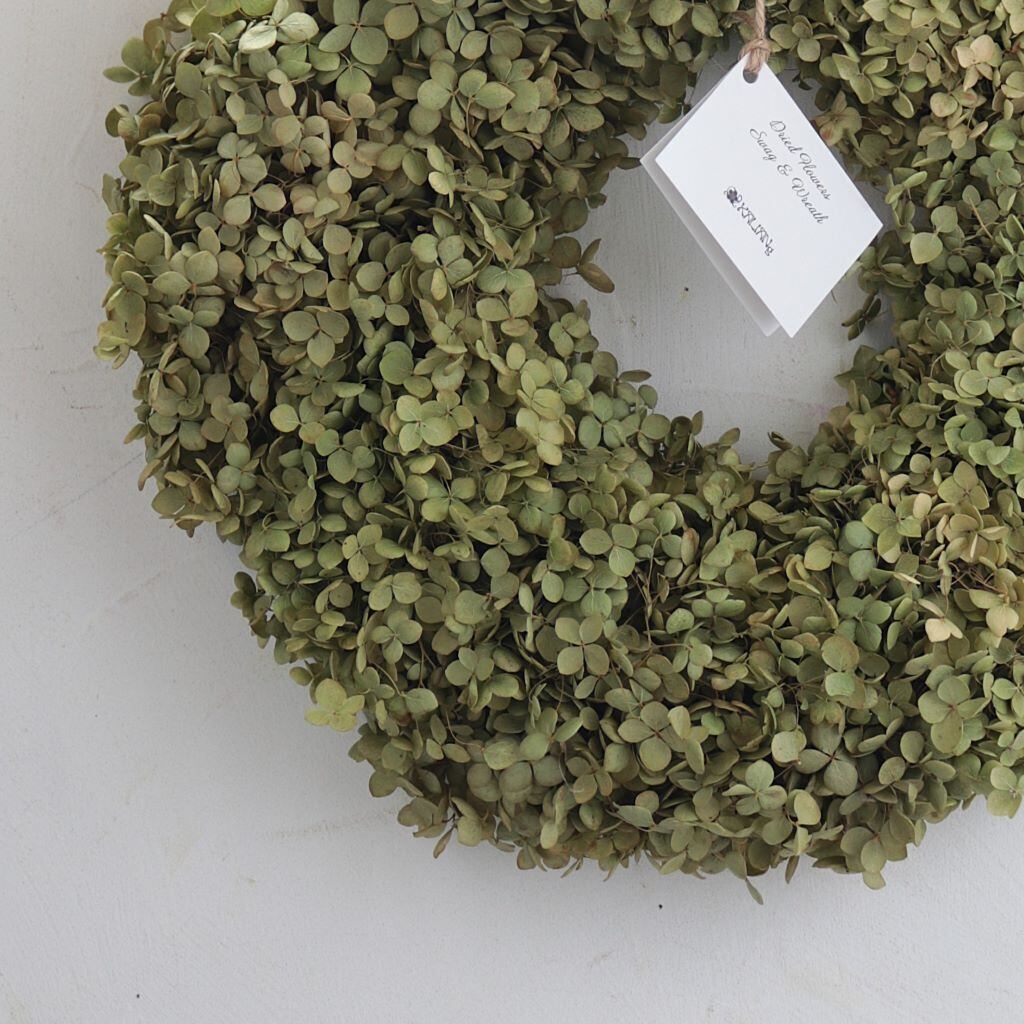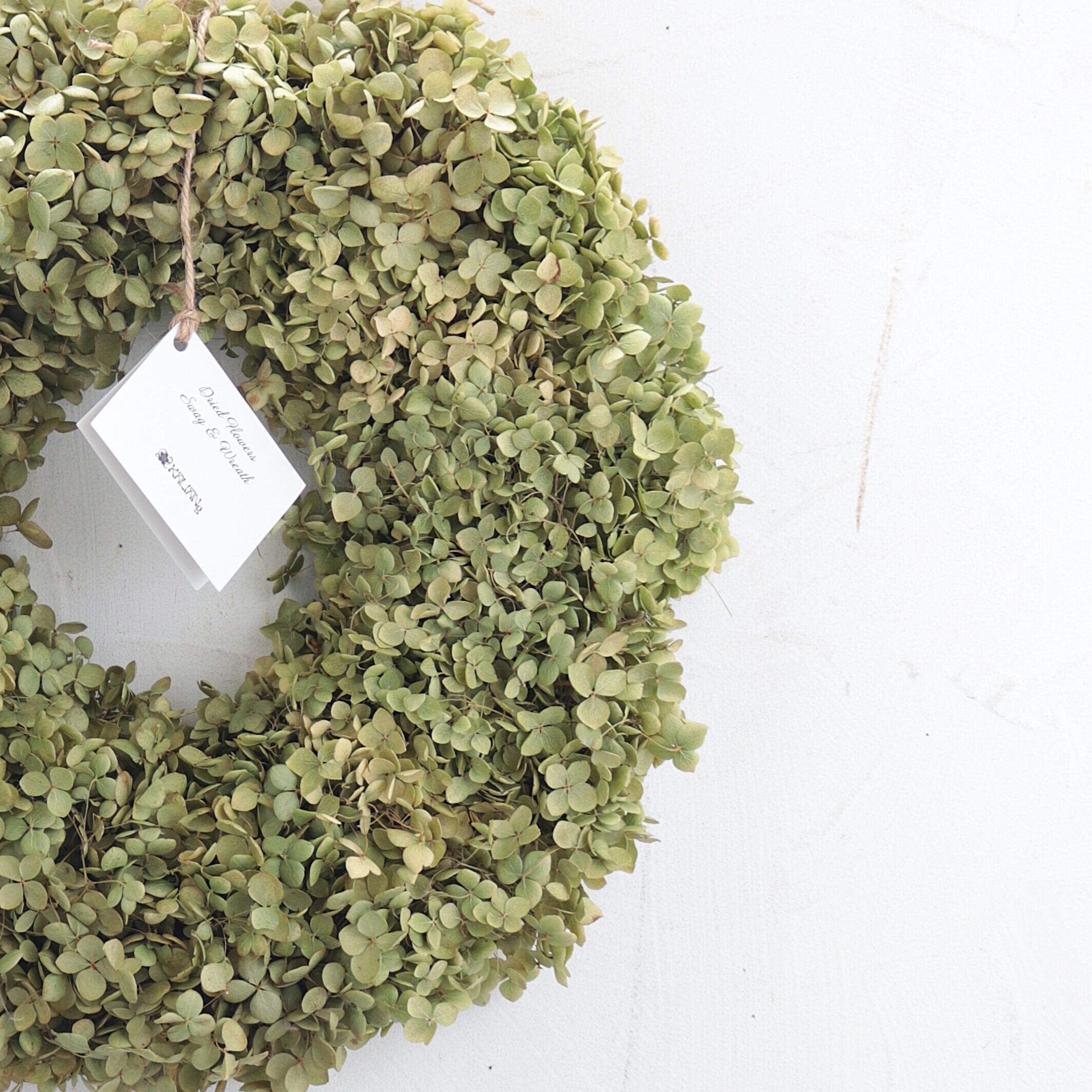 ドライフラワーを使ったリースです。グリーンのアジサイを使ってシックで大人らしいリースに仕上がりました。グリーンのアジサイは大輪系のアジサイとグリーンアナベルというアジサイをメインにアレンジメント。
