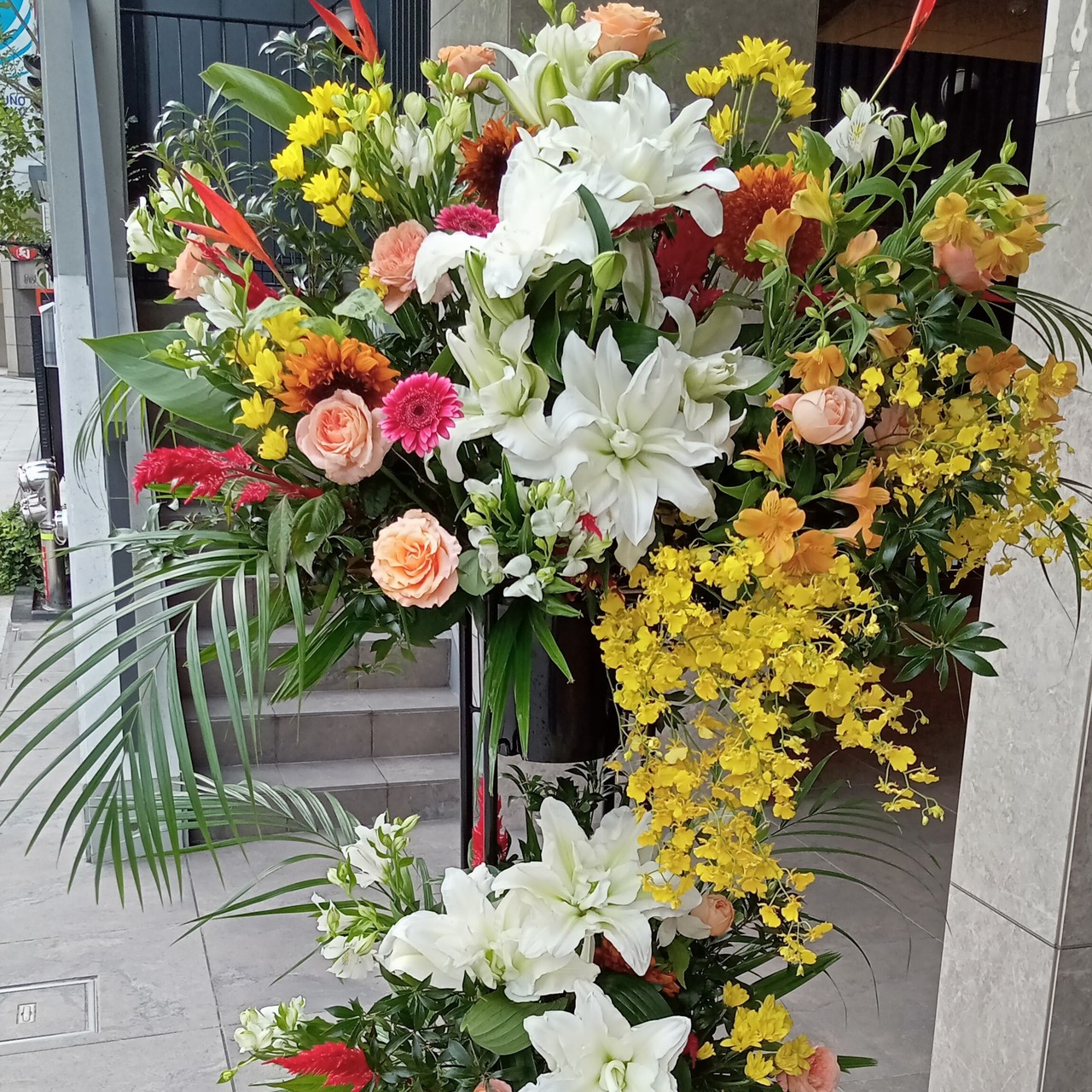 黄色とオレンジ系の花々は、「お祝い」や「明るさ」の象徴として、大切な方々に感謝や祝福の気持ちを伝えるのに最適です。特に開店祝いや開業祝いでは、華やかさが一層際立ち、訪れる方々の目を楽しませてくれることでしょう。