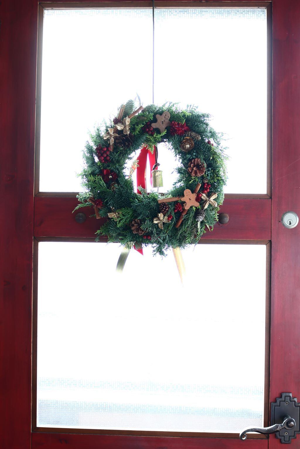 緑×赤のカラーとともに、シナモンスティックやジンジャークッキーなどを使ってアレンジメントしました。