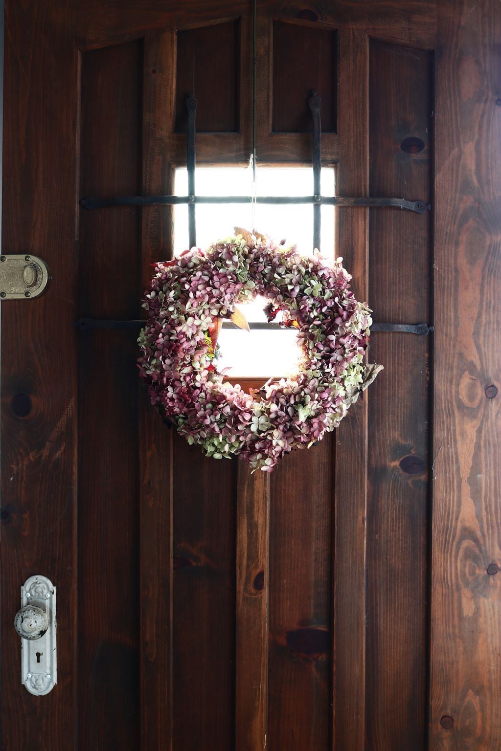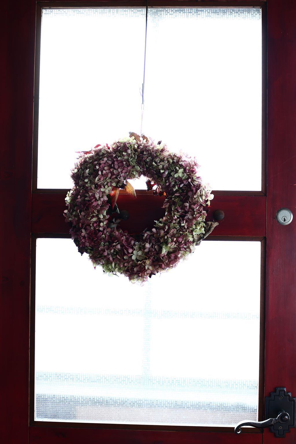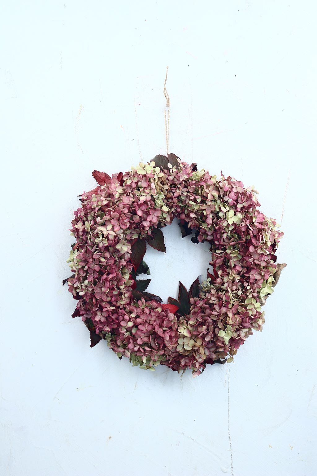 ドライフラワーを使ったリースです。紅葉したのアジサイ・ミナヅキを使ってシックで大人らしいリースに仕上がりました。ベースは紅葉した葉っぱを使用しています。
