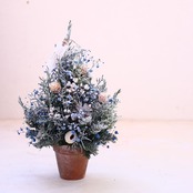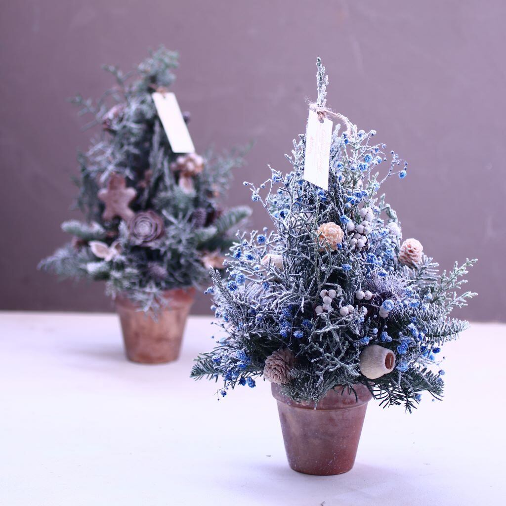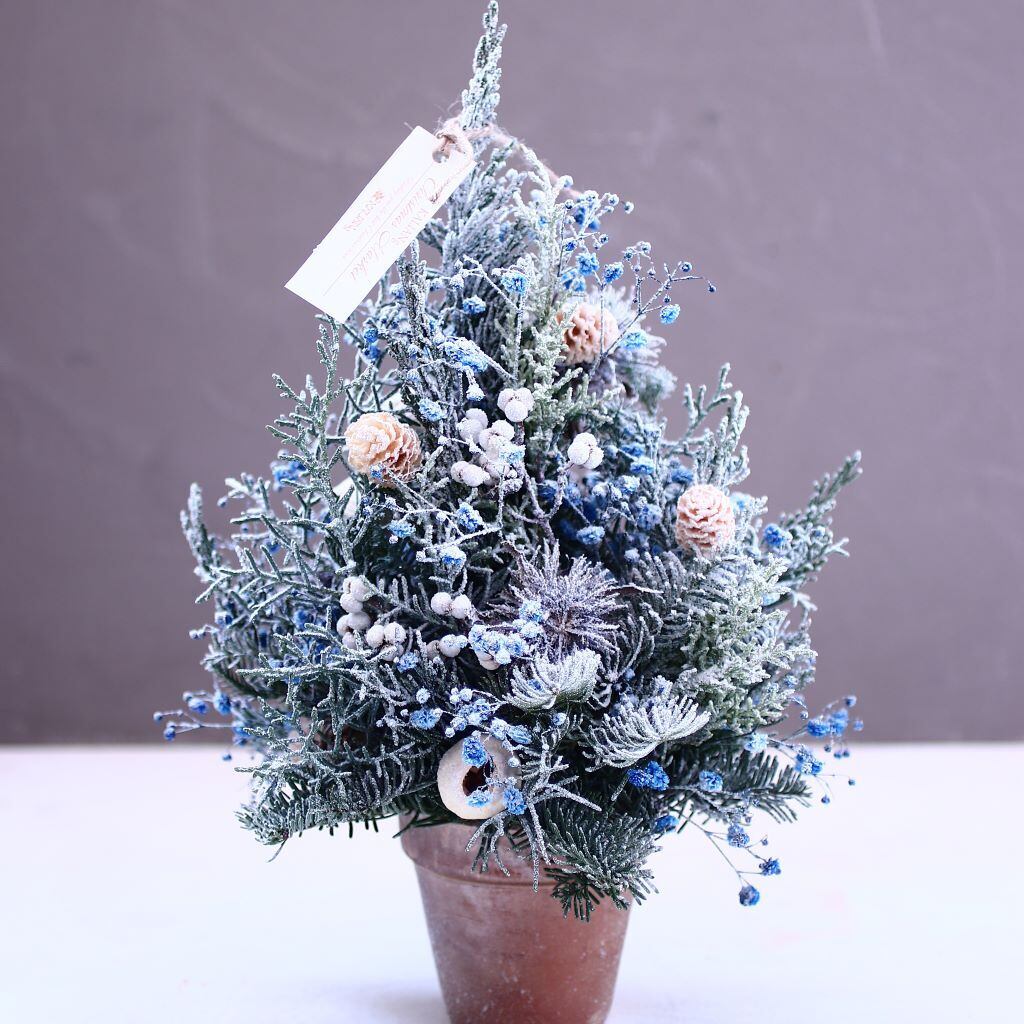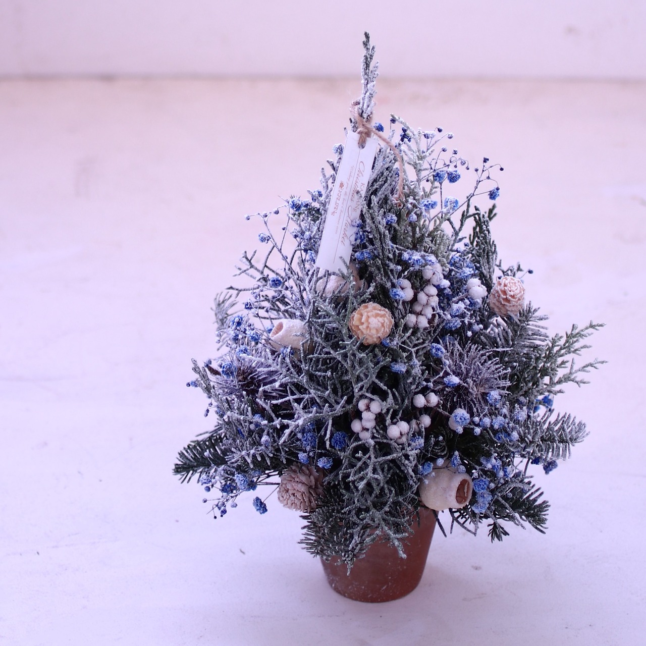 クリスマスアレンジメント「雪降るクリスマスツリー ホワイト&ブルー アレンジメント」Sサイズ クリスマスギフト トラッドスタイル