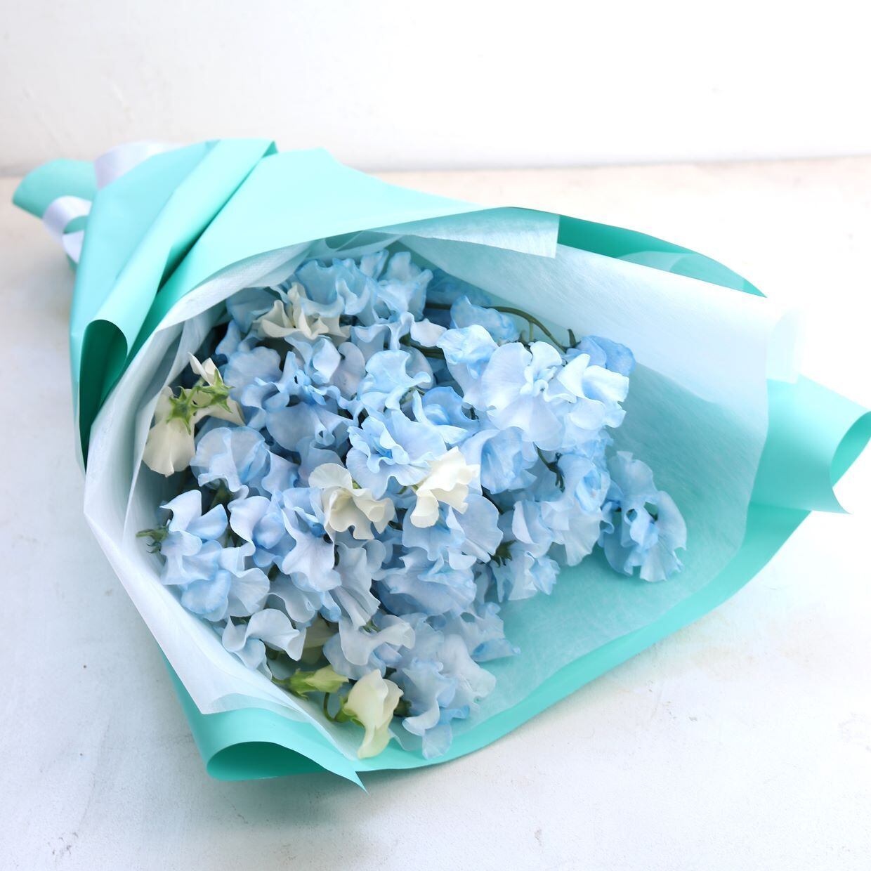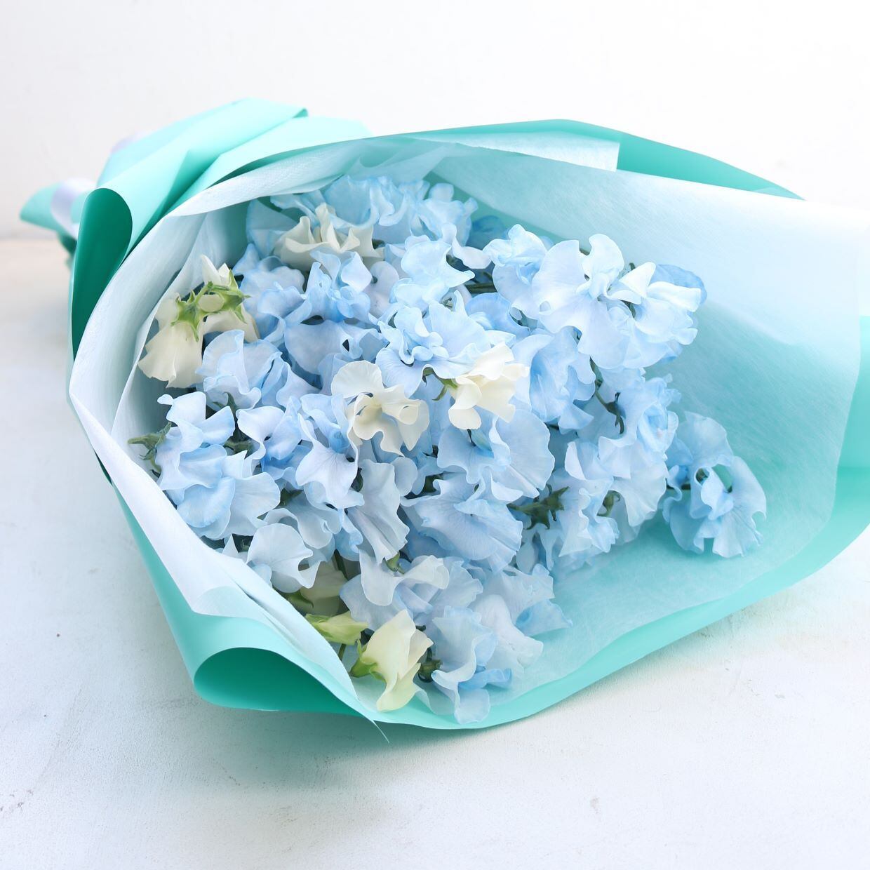 スイートピー「そらいろ」は、特別な染色をしています。スカイブルーの花は、幸せを呼ぶ花として人気です。また、近年卒業式や成人式でブルーのお花を贈ります。